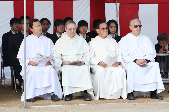 まず、真ん中に、聖ドミニコ修道会の代表が座っています。なぜかというと、約70年前に、先輩たちの将来構想(ビジョン)と決議によって、愛光学園が誕生し、その時からずっと、学園を導いてきているからです。