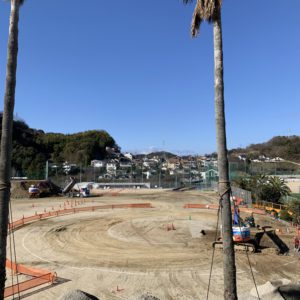 人工芝のすぐ側に新校舎の玄関となる本部棟の工事が始まりました。