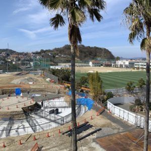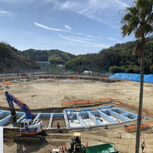 ショベルカーが新校舎の水槽みたいなところに土を埋め始めています。