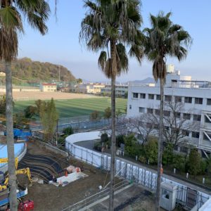 新校舎から見える桜並木、生徒皆さんの良い思い出になりそうですね。