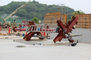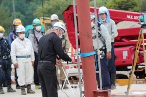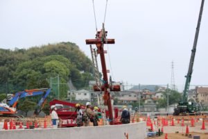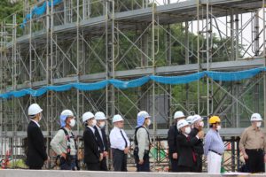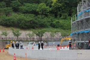 5月27日(火)「立柱式」が執り行われました。 工事の安全を願って工事関係者がお酒、お塩、お米を撒きます。 ホアン・ベルモンテ理事長も柱の四隅にお塩を撒いて、式は滞りなく終了しました。