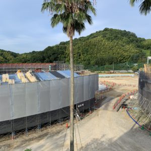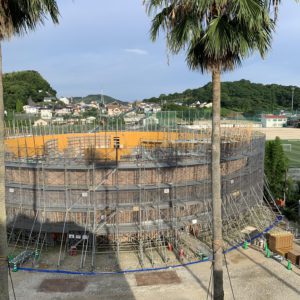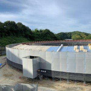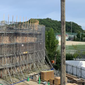 本部棟の空に向かって広がるような独特の構造が見えてきました。