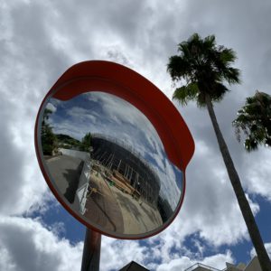 3枚目:ドミニコ寮玄関前のカーブミラーに映る本部棟