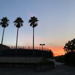 1枚目:ドミニコ寮玄関前から見た夕陽と本部棟