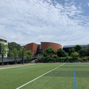 人工芝のグリーンと青空に新校舎が映えますね!