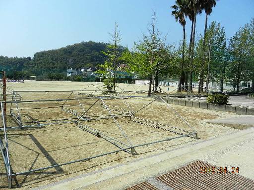 体育の時間の一部を利用して,テントの骨組みを作り始めました。