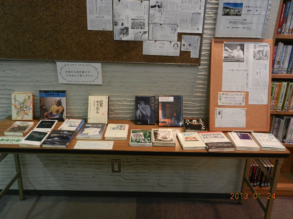また,常設されている「卒業生の著書コーナー」もあります。さまざまな分野で活躍されている卒業生の著書の一部が並べられています。私の同級生の著書もあります。
