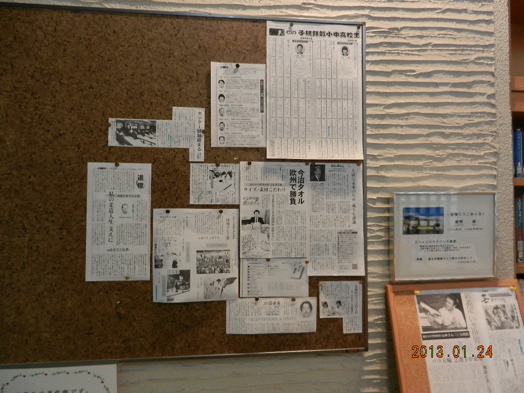 上の写真に写っている掲示板には,最近卒業生や在校生が掲載された新聞の切り抜きが貼ってあります。