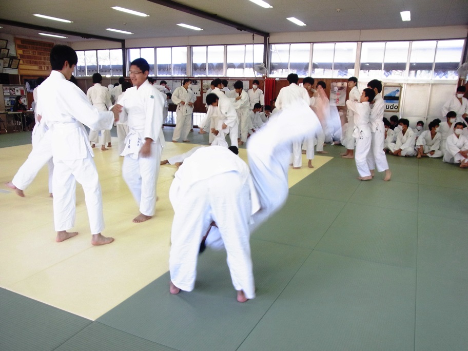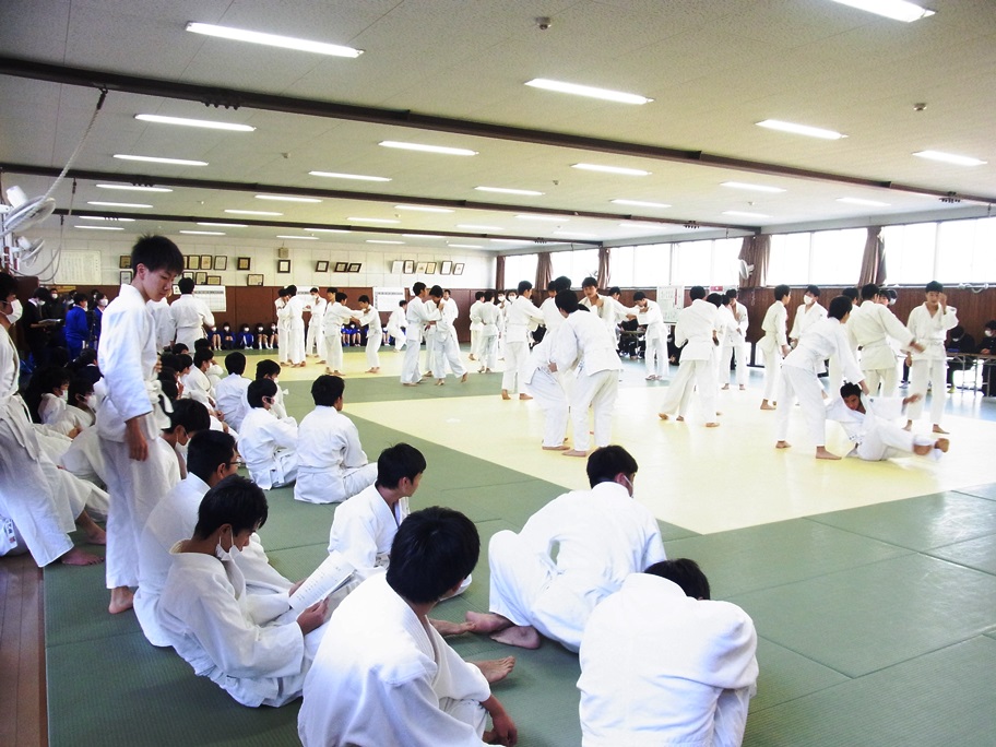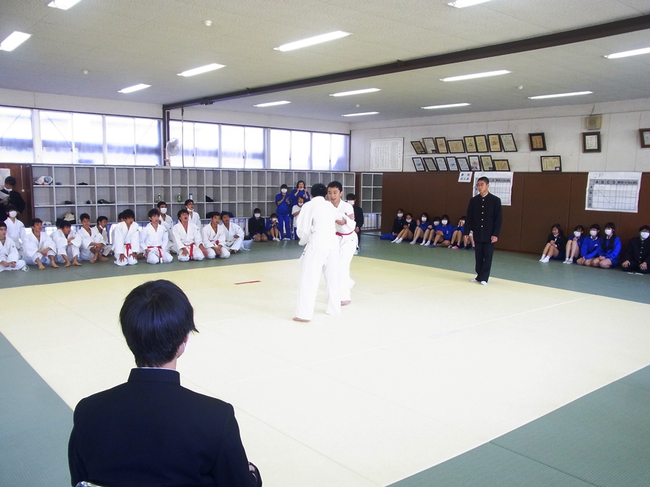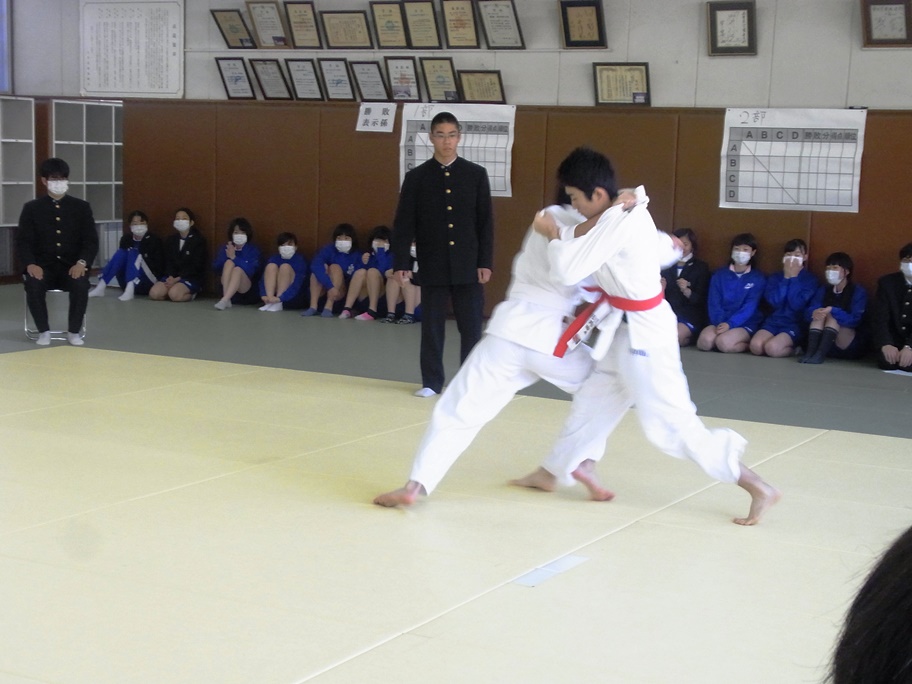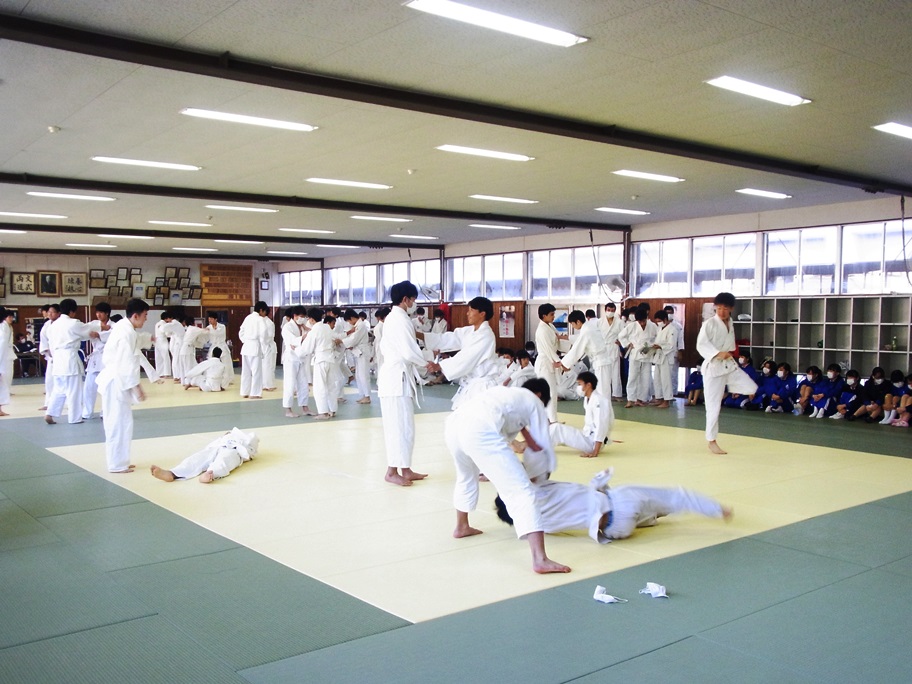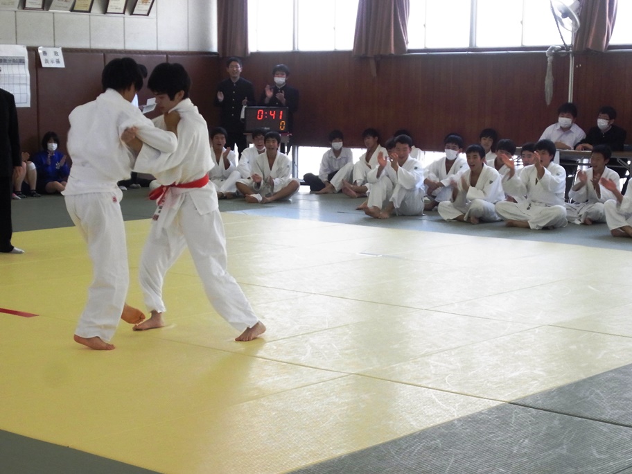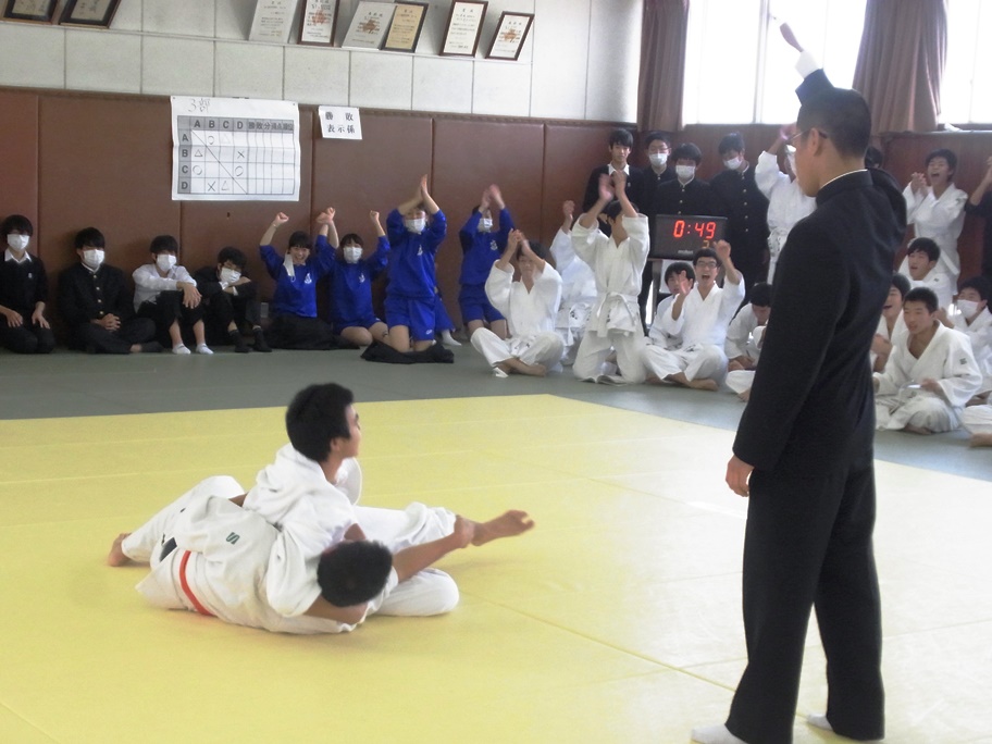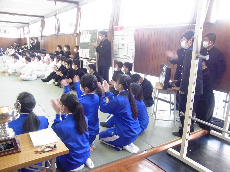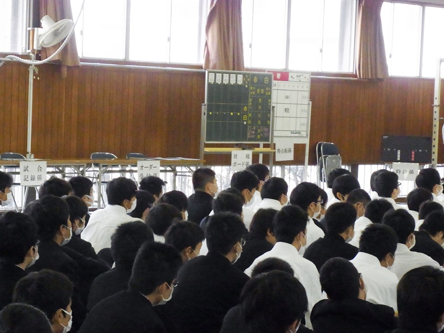 各クラス3チーム編成のリーグ戦という形式です。選手以外の男子生徒は,審判・計時・掲示・記録等の係に就き,女子生徒はクラス応援団を結成。道場内は生徒たちの熱気で暑(熱)かった!