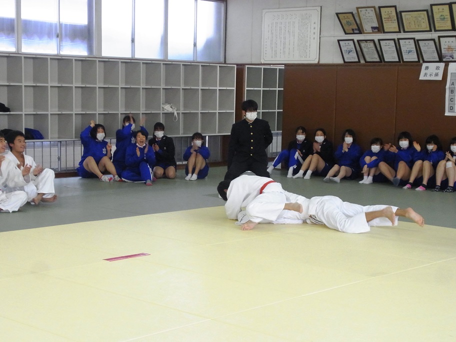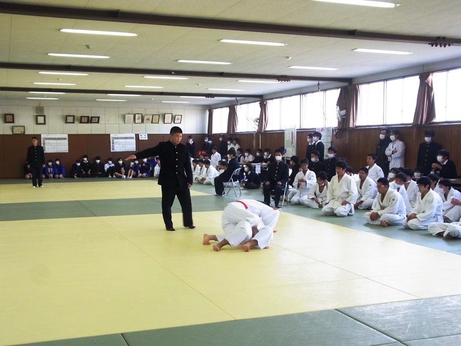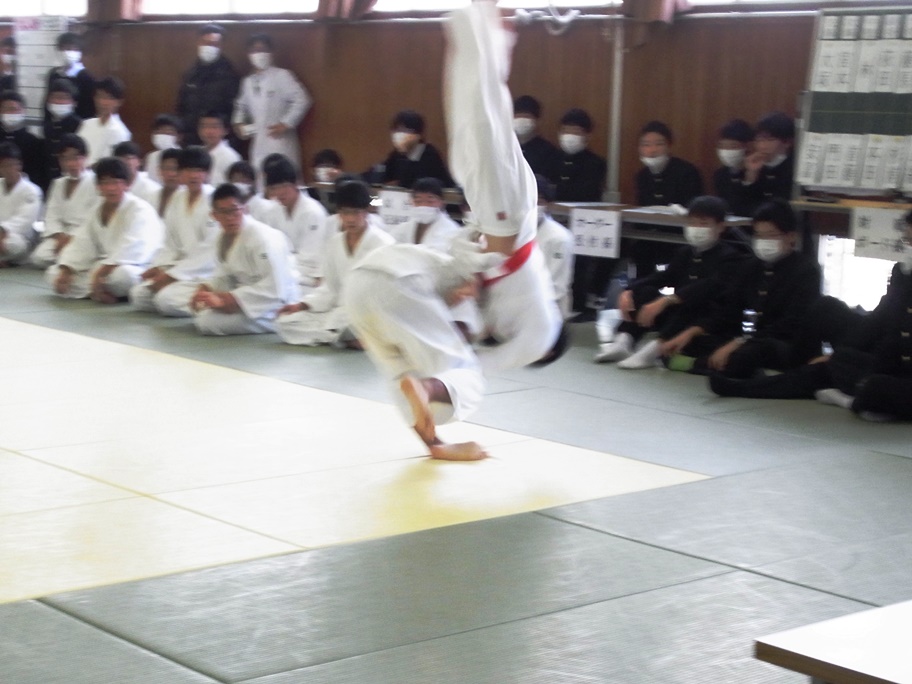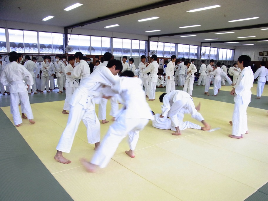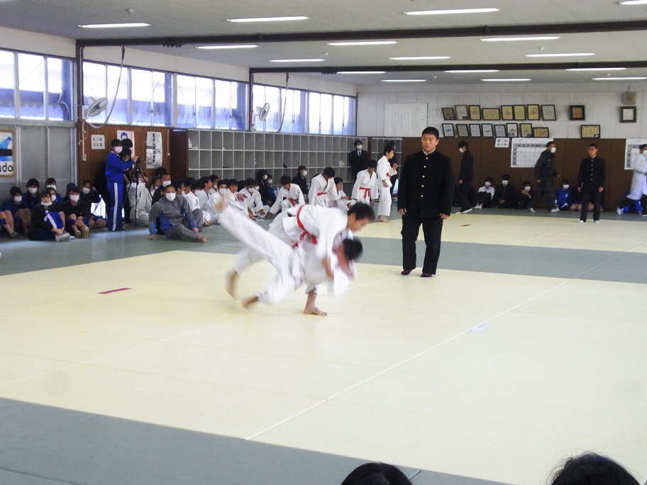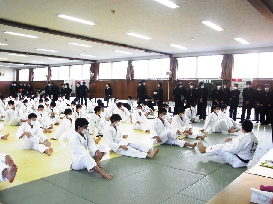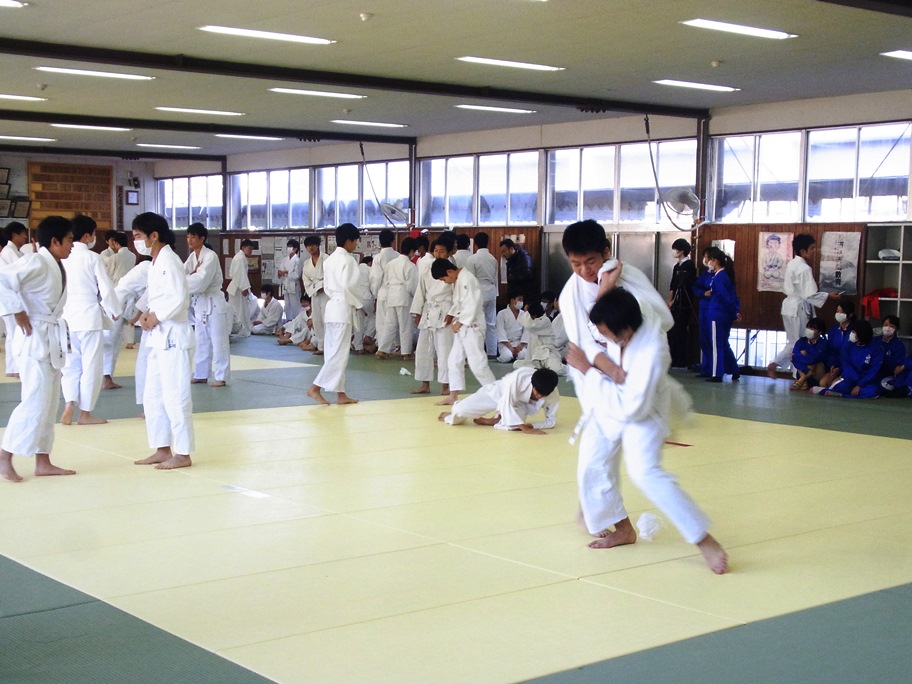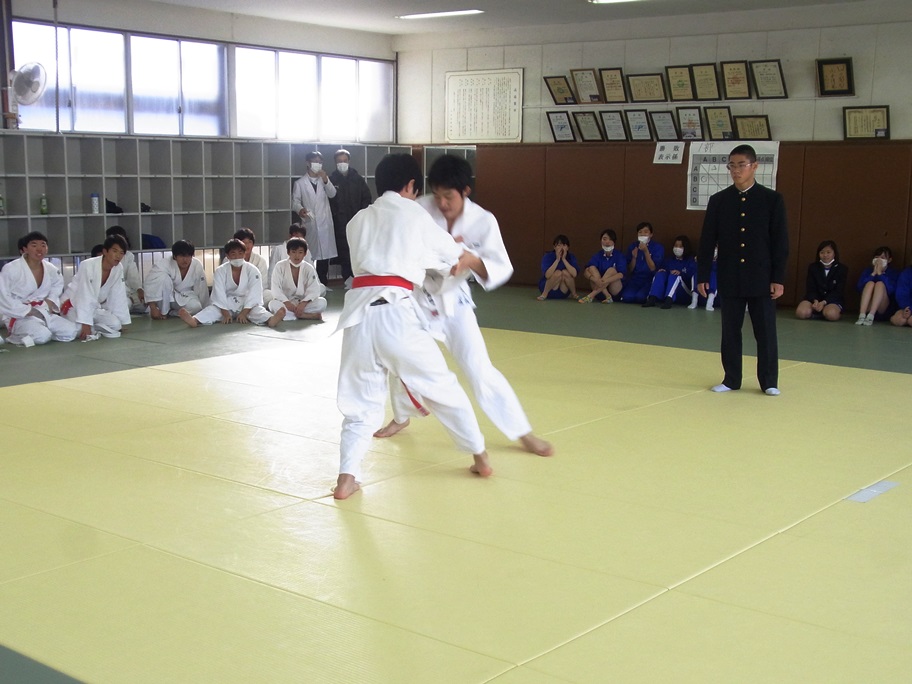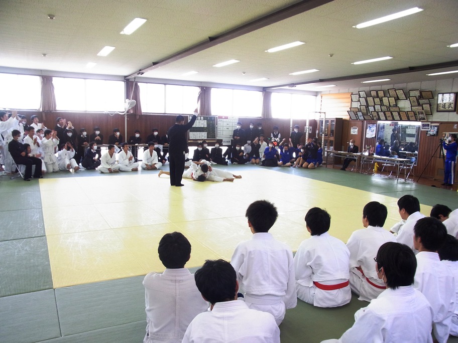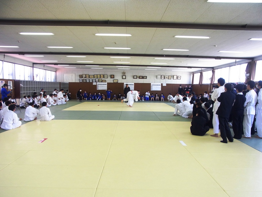 各クラス3チーム編成のリーグ戦という形式です。選手以外の男子生徒は,審判・計時・掲示・記録等の係に就き,女子生徒はクラス応援団を結成。道場内は生徒たちの熱気で暑(熱)かった!