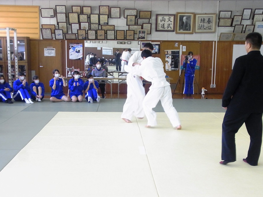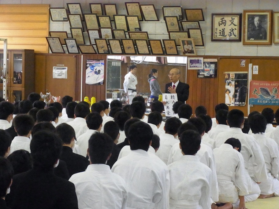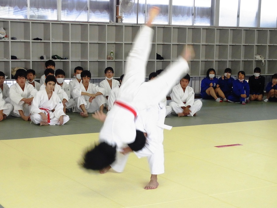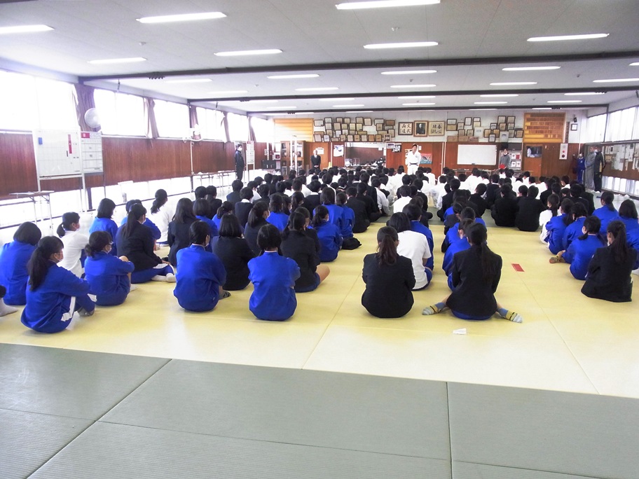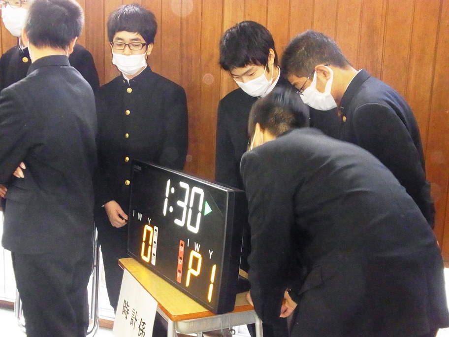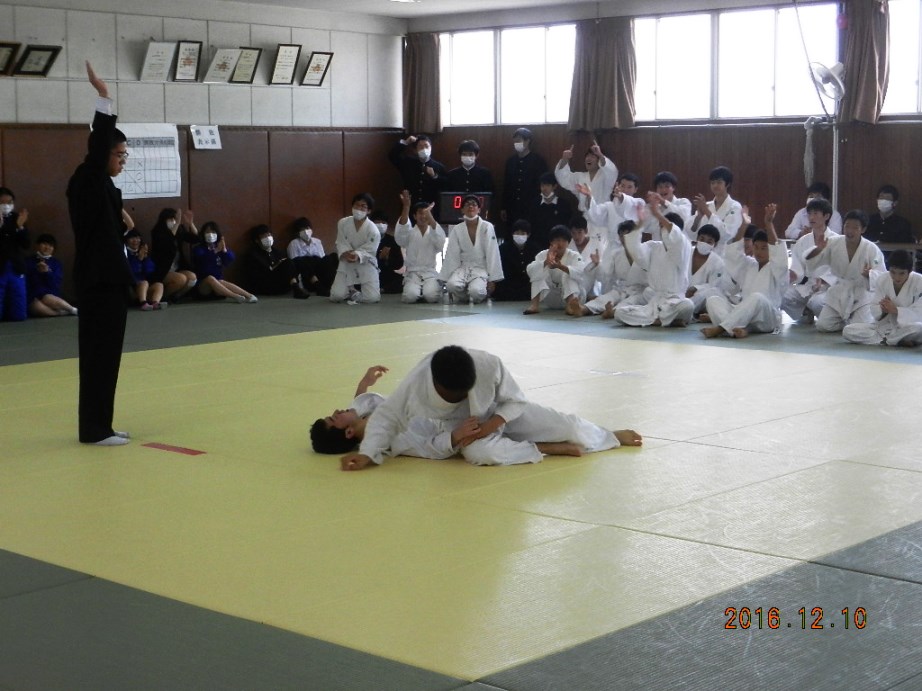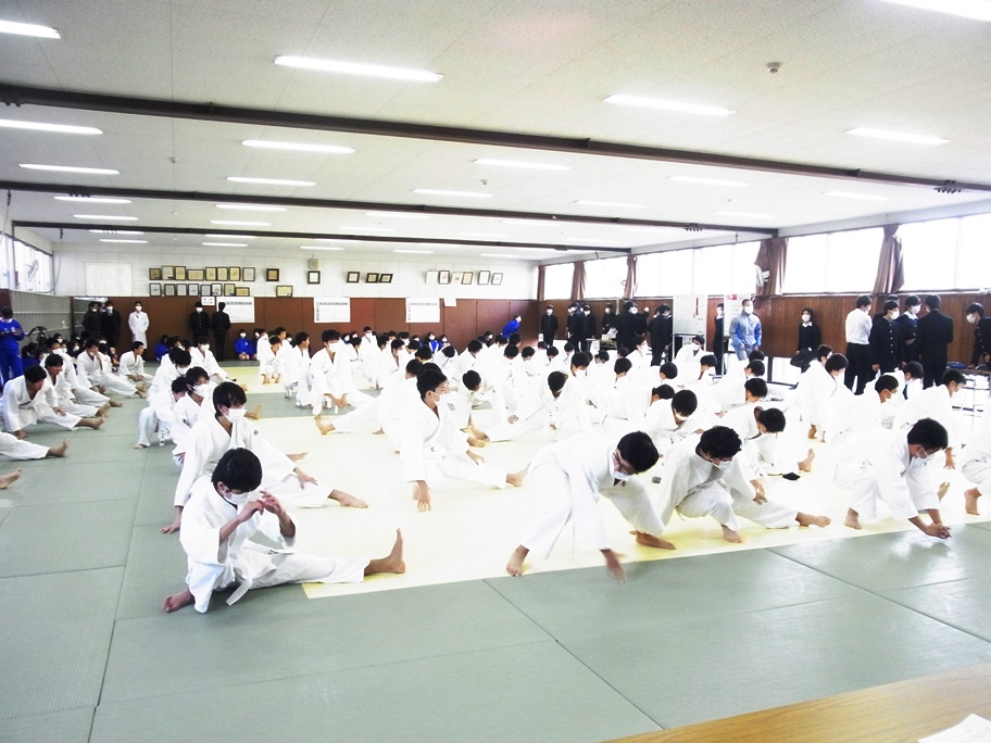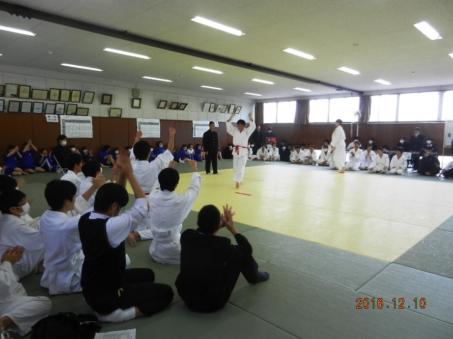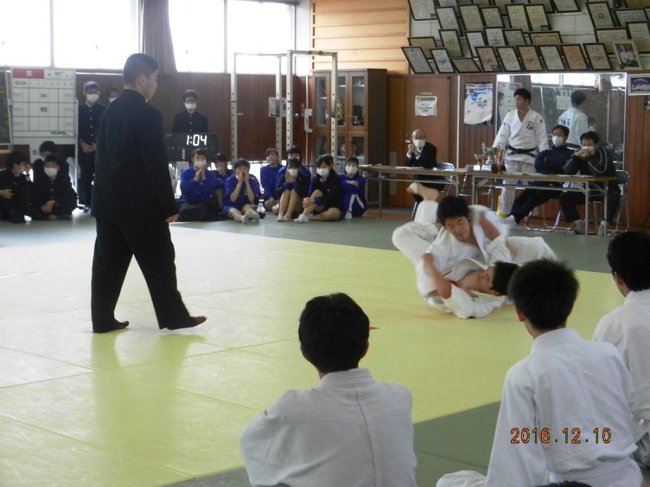 各クラス3チーム編成のリーグ戦という形式です。選手以外の男子生徒は,審判・計時・掲示・記録等の係に就き,女子生徒はクラス応援団を結成。道場内は生徒たちの熱気で暑(熱)かった!