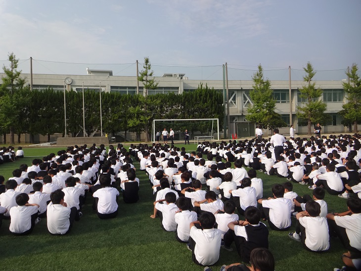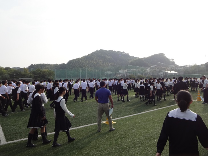 グラウンドに避難後はクラスごとに整列、担任の先生による点呼です。