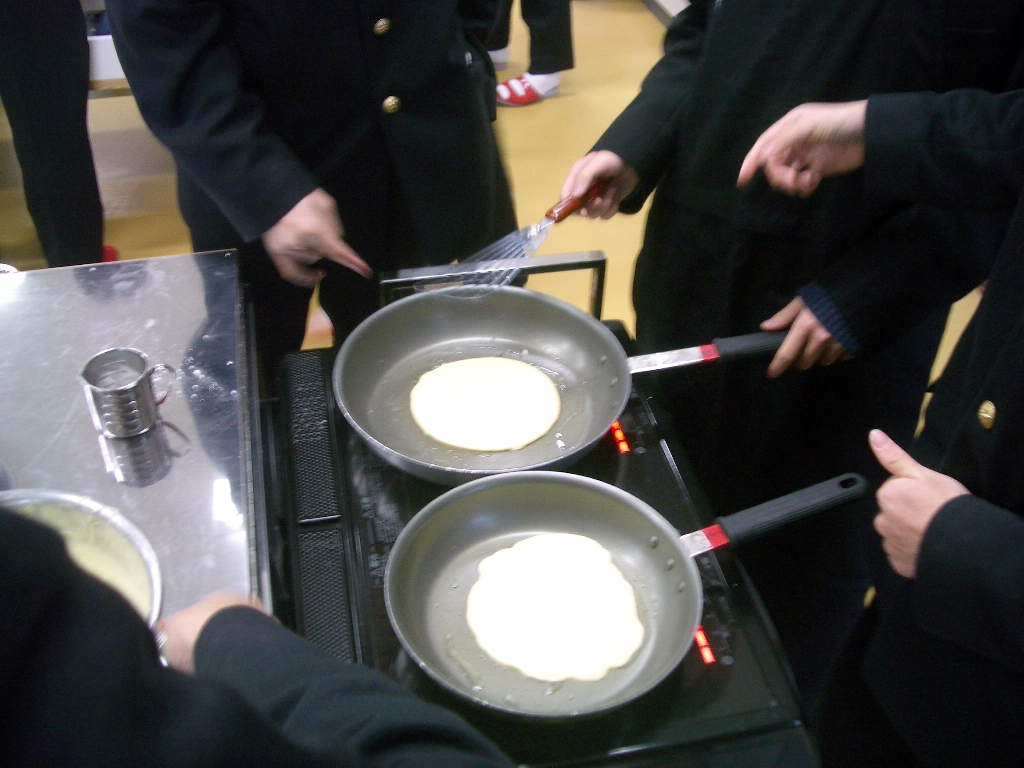 ホットケーキ用の粉・卵・牛乳(イチゴミルクジュース)に加えて、班によってはチョコレート・(缶詰の)桃などを混ぜて生地を作り、フライパンで焼いていました。