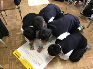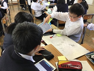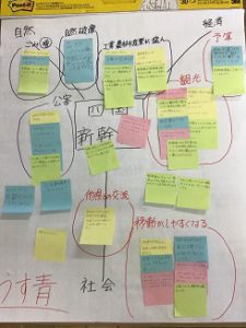 Yチャートというシンキングツールを使い、自然・経済・生活の3つの観点で、グループで上がった変化や影響を分類していきました。