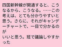 完成したYチャートを踏まえて、四国に暮らす一人として、次はキャンディーチャートというシンキングツールを使い、四国新幹線開通の是非を表明しました。