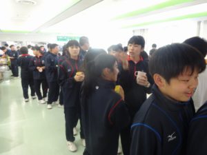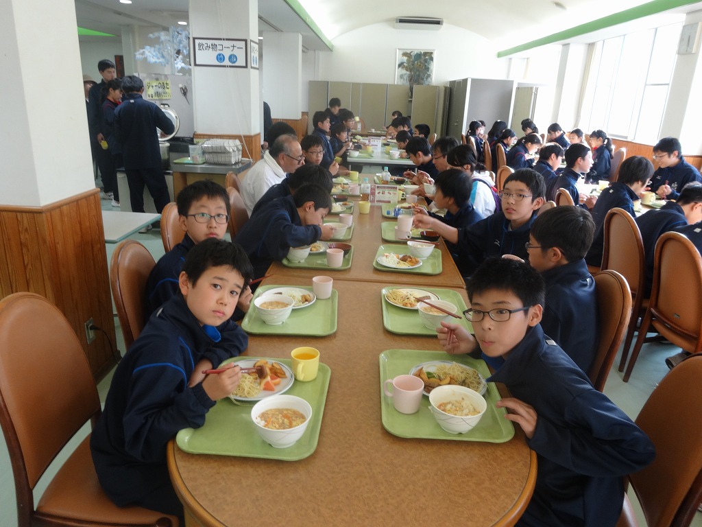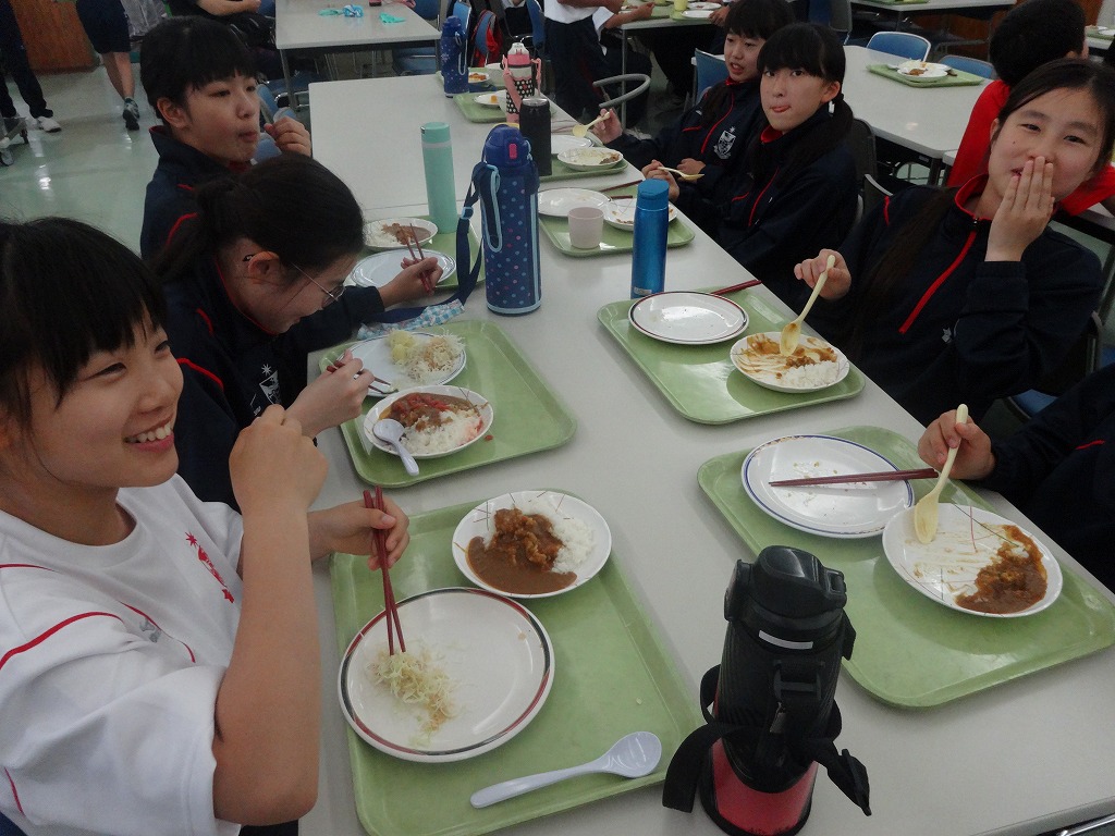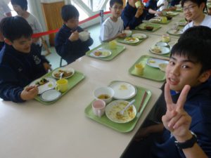 入所式の後は、大洲での初めての食事。バイキング形式で思い思いの量を食べていました。