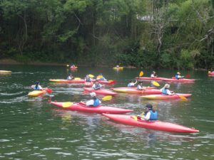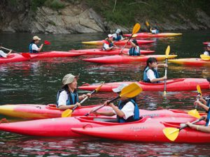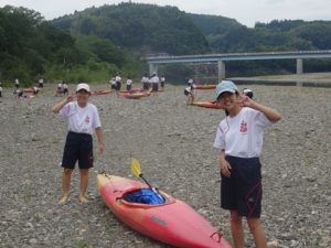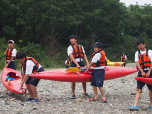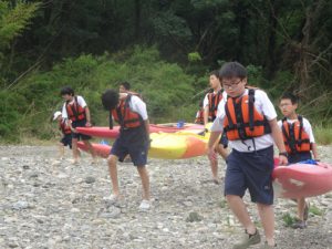 バスで移動したあと、各ペアごとに川までカヌーを運びます。
