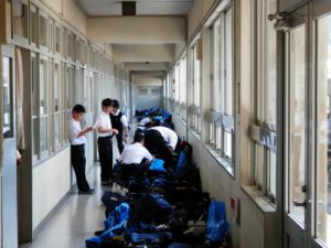 テスト直前の中一生前の廊下。プリントやノートを見返し、最後の確認に余念がありません。