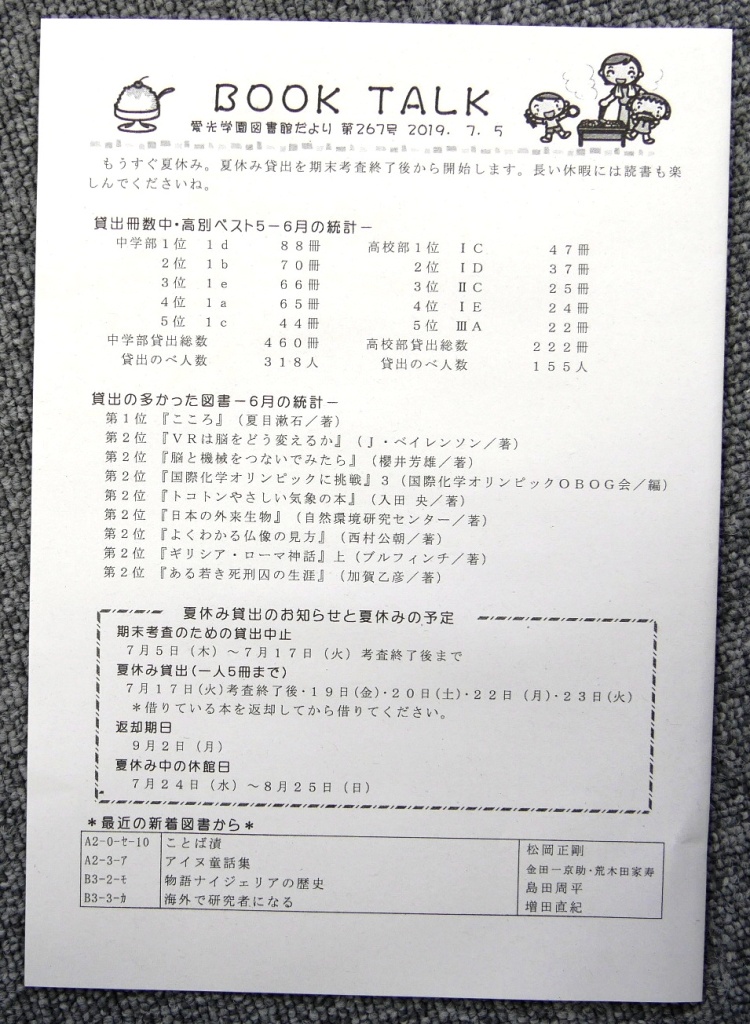 毎月1回、図書館から発行している「BOOK TALK」。「貸出の多かった図書」で第1位が「こころ」(夏目漱石)。