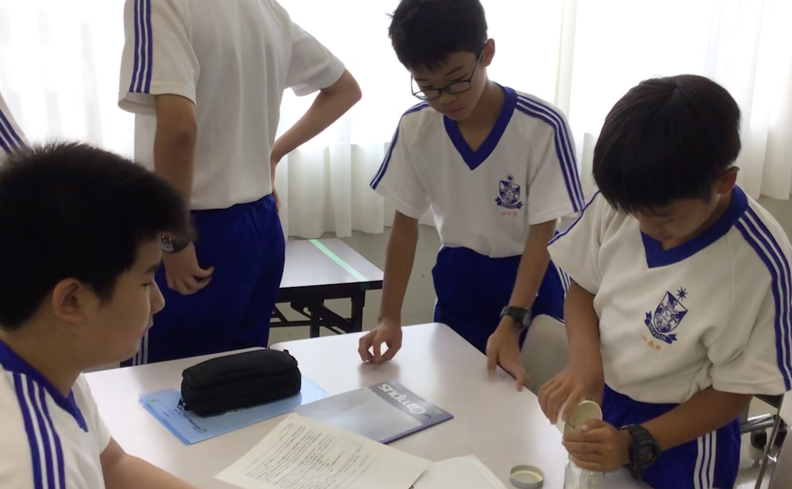 実技試験ではガラスビンの中におもりを入れ、斜面をゆっくり転がる時間と早く転がる時間の差を競いました。