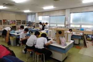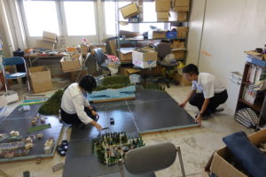 高校棟の屋上出口前では、鉄道研究部がジオラマを作成していました。