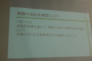 白色粉末を調べる方法は班ごとに違うので、手順を全班員で確認しました。