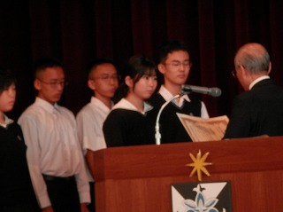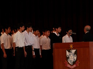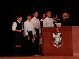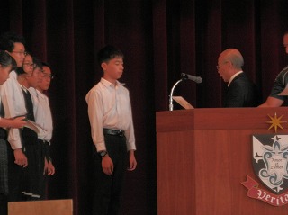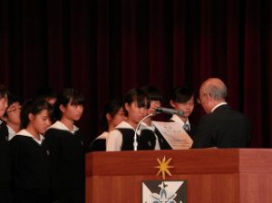 水泳、陸上部、テニス部、ソフトボール部、俳句 の大会で結果を残した生徒たちが、中学部の全生徒の前で表彰されます。