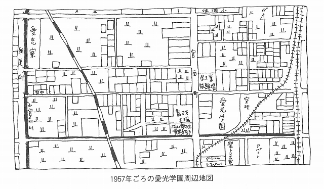 市電軌道をまたぐ学園発足当時の校地面積は約2500坪。運動場も一周200メートルもない狭さであった。