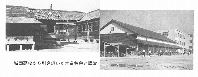 城西高校から引き継いだ校地には、戦災後建てられた木造校舎や講堂があり、生徒募集中止によって空き部屋となった教室を使用したり、 一部改装したりしながらの授業だった。