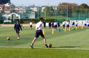 しばらくすると、一人ずつコーンの間をぬうようにドリブルしてた。タイムを計ってテストしているようだ。