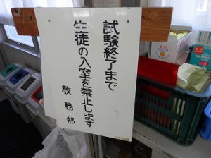 定期試験時の風物詩(?)といえばこの立て札。テスト作成のため、職員室への入室が制限されます。