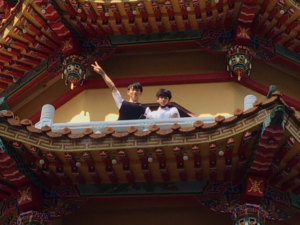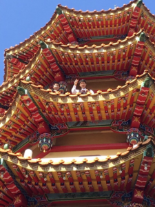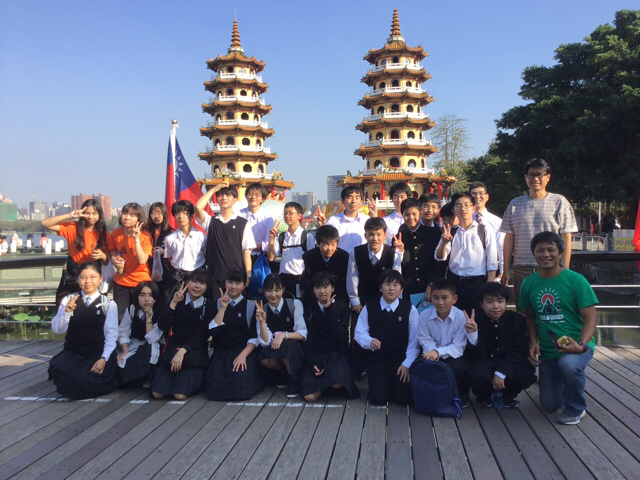 道明の先生方(潘老師・KEN老師)に道明生と一緒に蓮池潭(れんちたん)に連れて行って頂きました。後ろには龍虎塔が見えます。