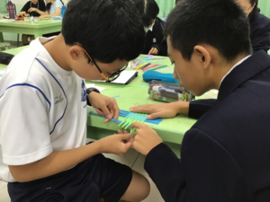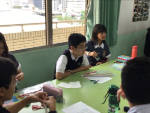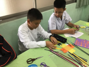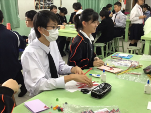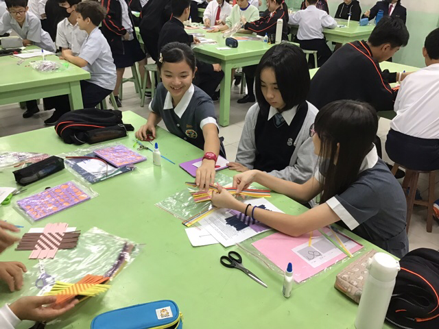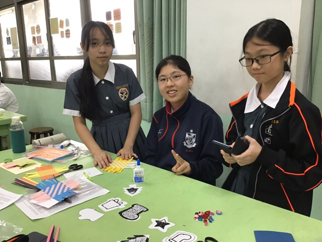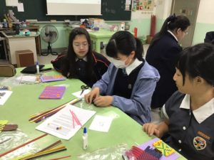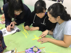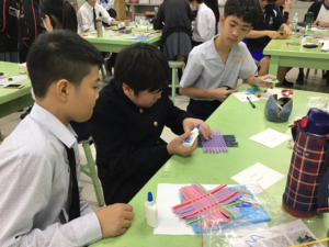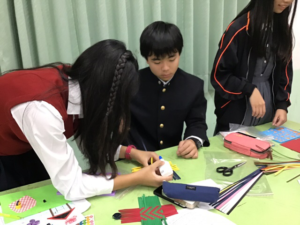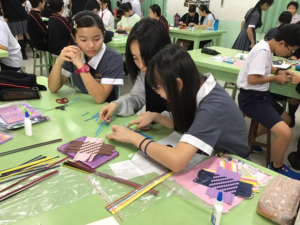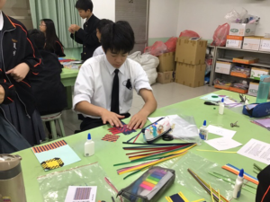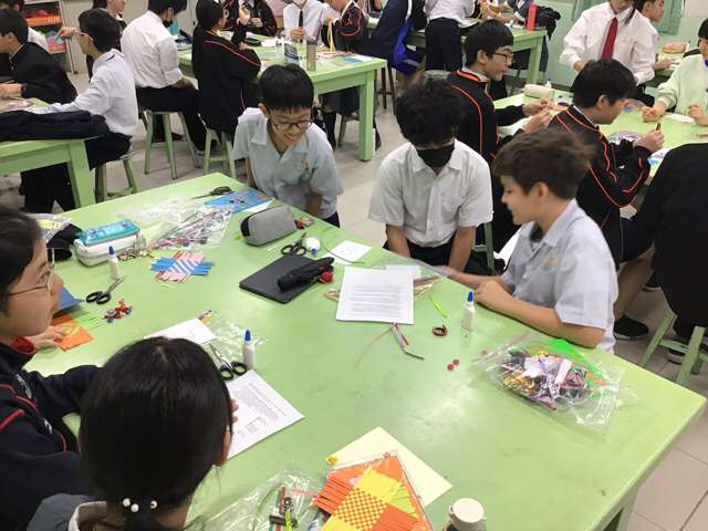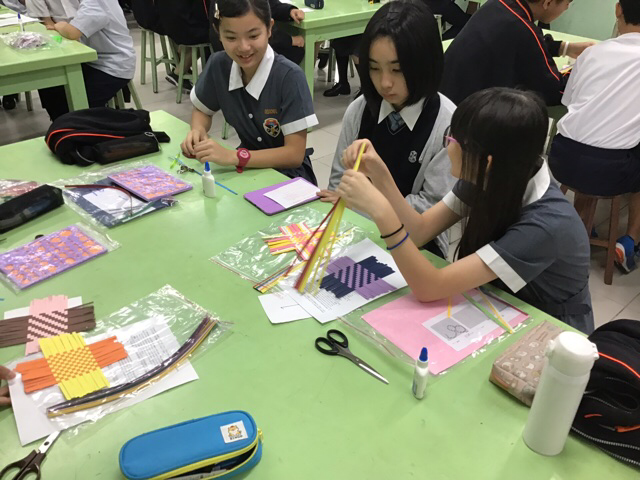 今日は家庭科の授業に参加しました。色紙を切り、その紙を編んで模様を作っていました。