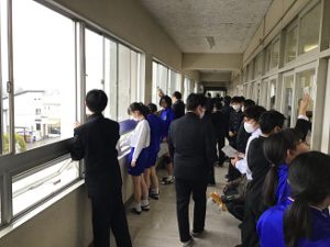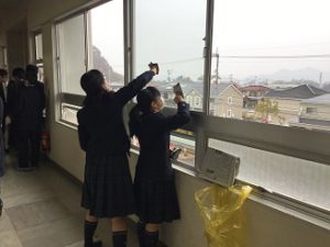 掃除の時間、外の掃除担当者は、廊下の窓を磨いてくれました。