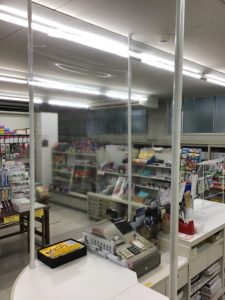 飛沫防止のシートです。町中のあちこちでももうおなじみです。