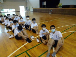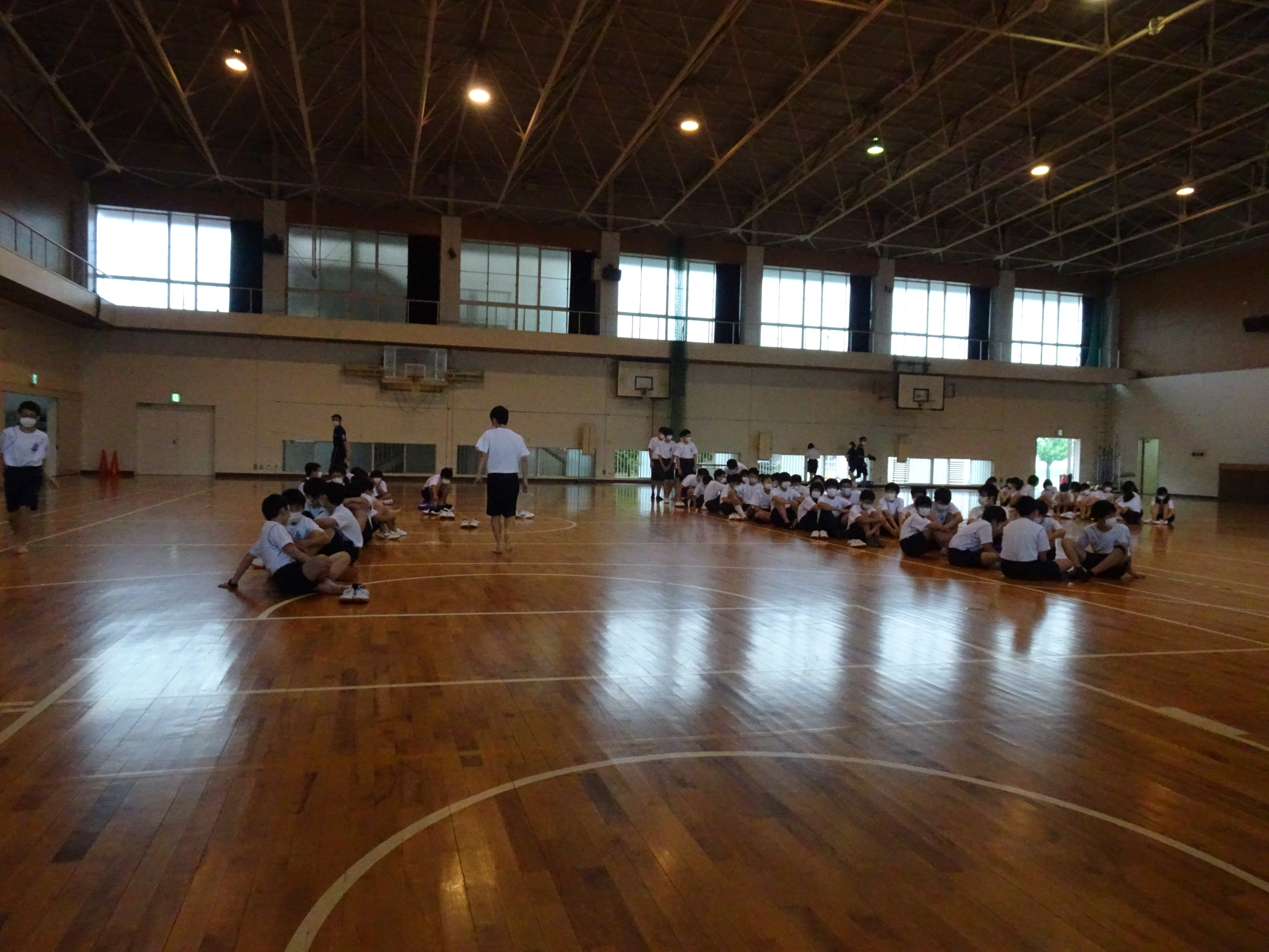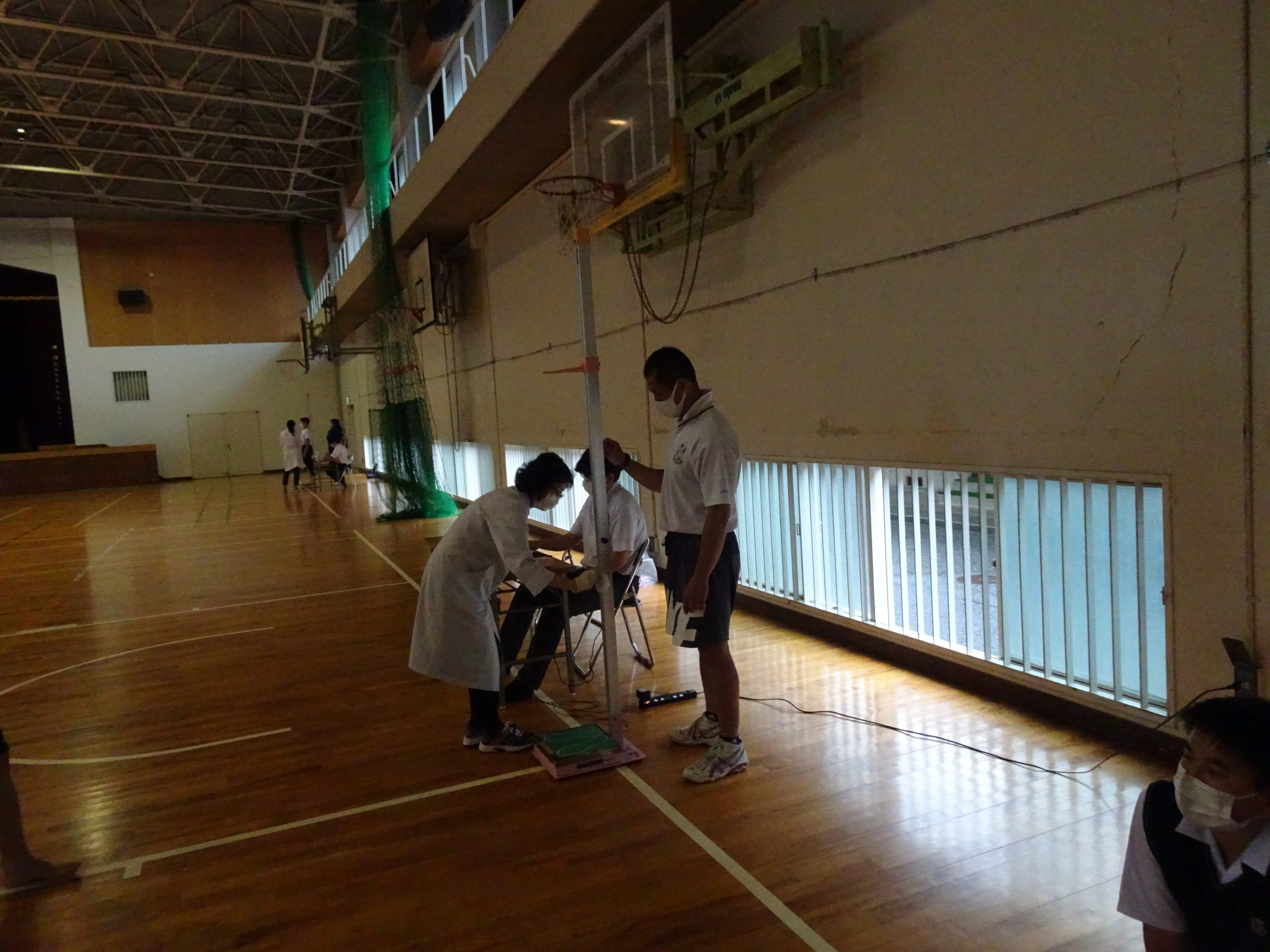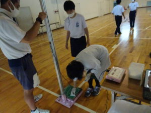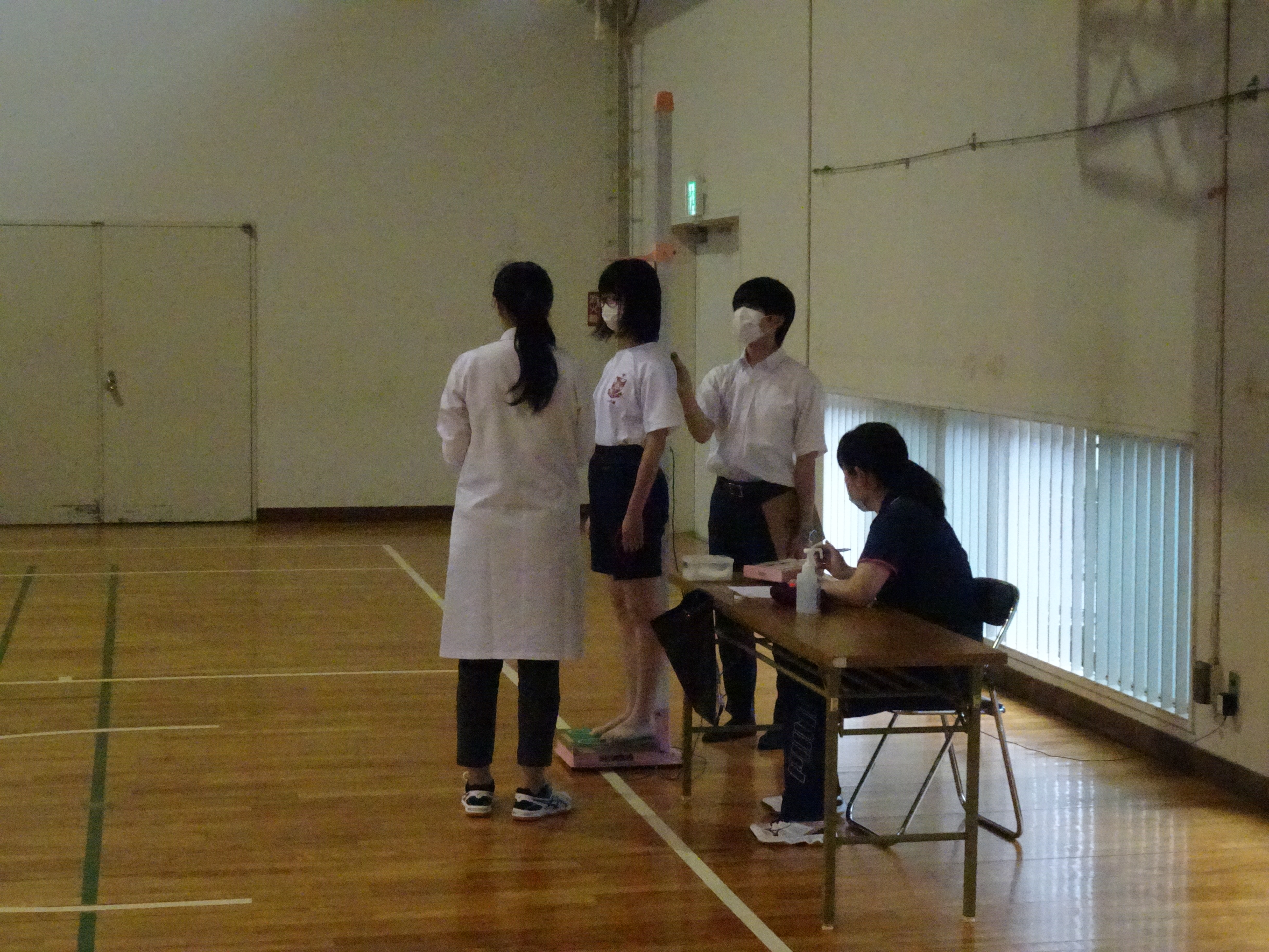例年全学年一斉に行われる身体測定ですが、今年はコロナウィルス蔓延に伴う「密」状態の回避のため、体育の授業時間内に行われています。今回は中二生の身体測定にお邪魔しました。