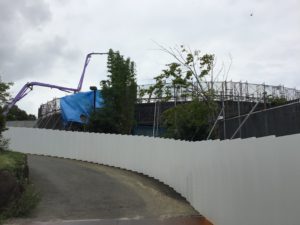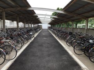 高校駐輪場奥が白いボードで行き止まりになっています。更に奥は工事現場です。