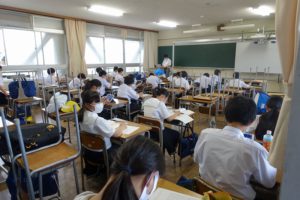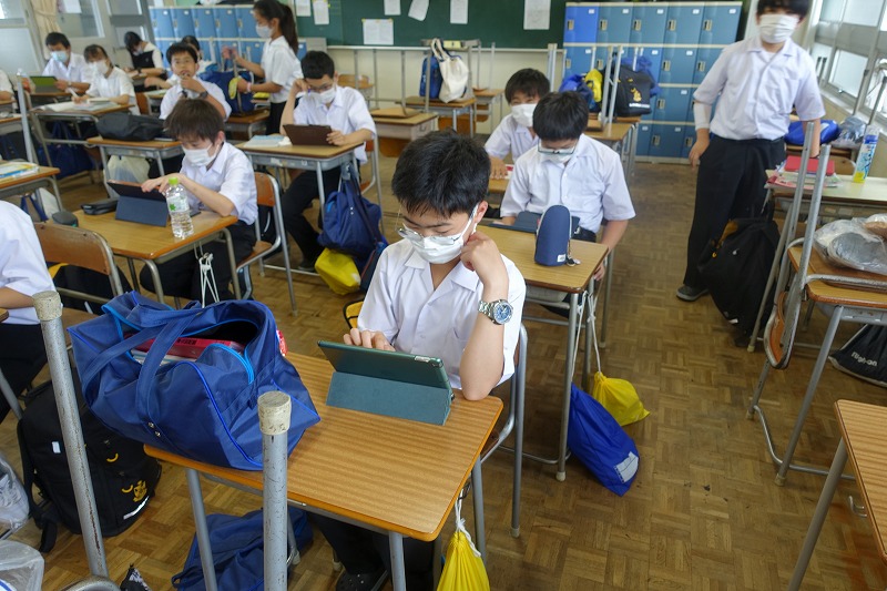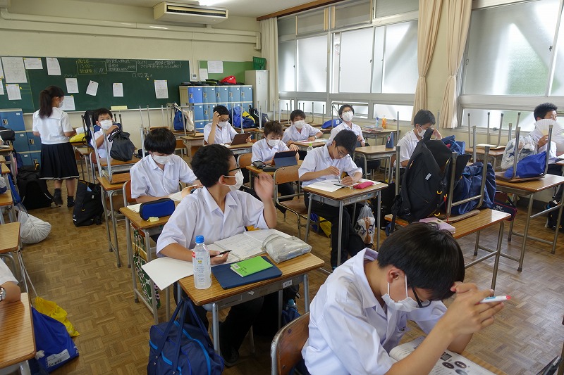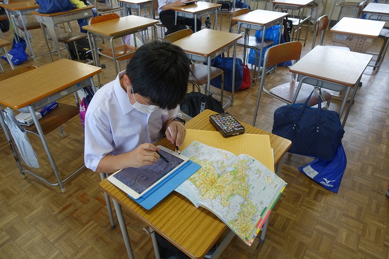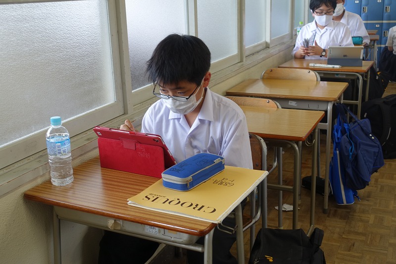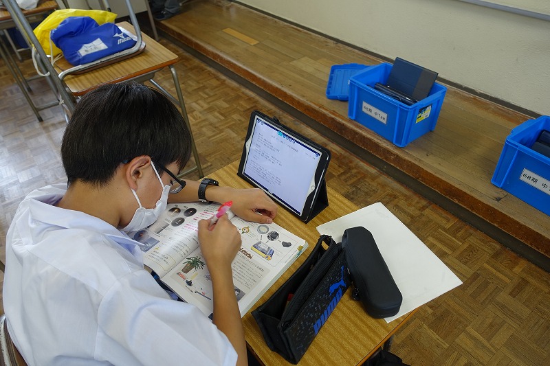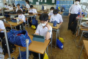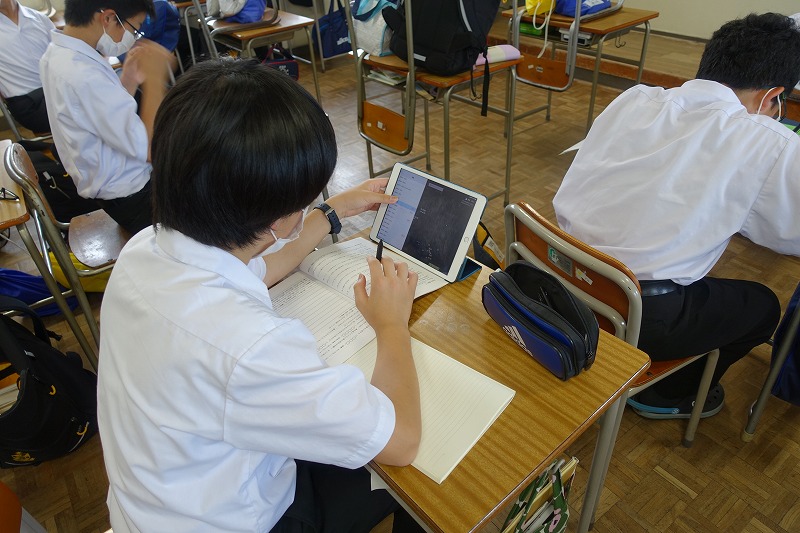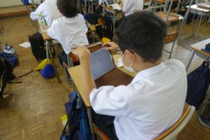 生徒達は、タブレットで調べものをしたり、教科書と見比べたり・・・・・・、分からないところを質問しに職員室へ行く生徒もいます。