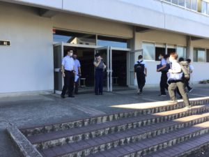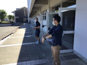 現在、生徒たちは健康観察を出してから登校していますが、忘れた生徒のために玄関前で検温をしています。