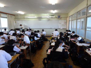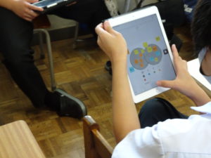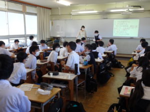 A、B二種類の出汁を飲んで、それぞれの感想を周りの生徒と話しています。