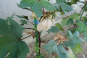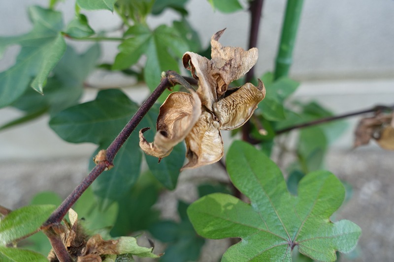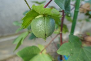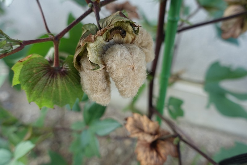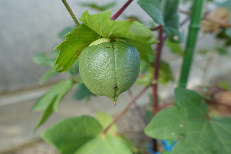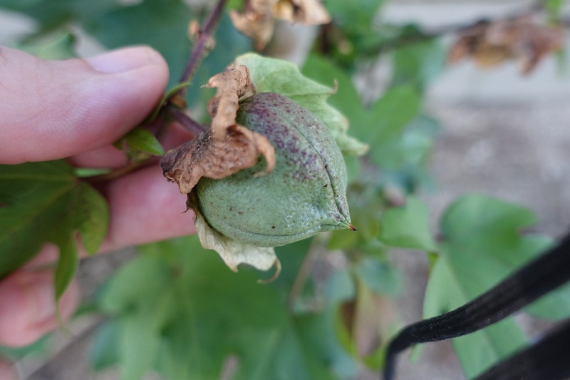 小さな花壇に一畝だけの綿花畑ですが、収穫量はどれくらいになるのでしょう。