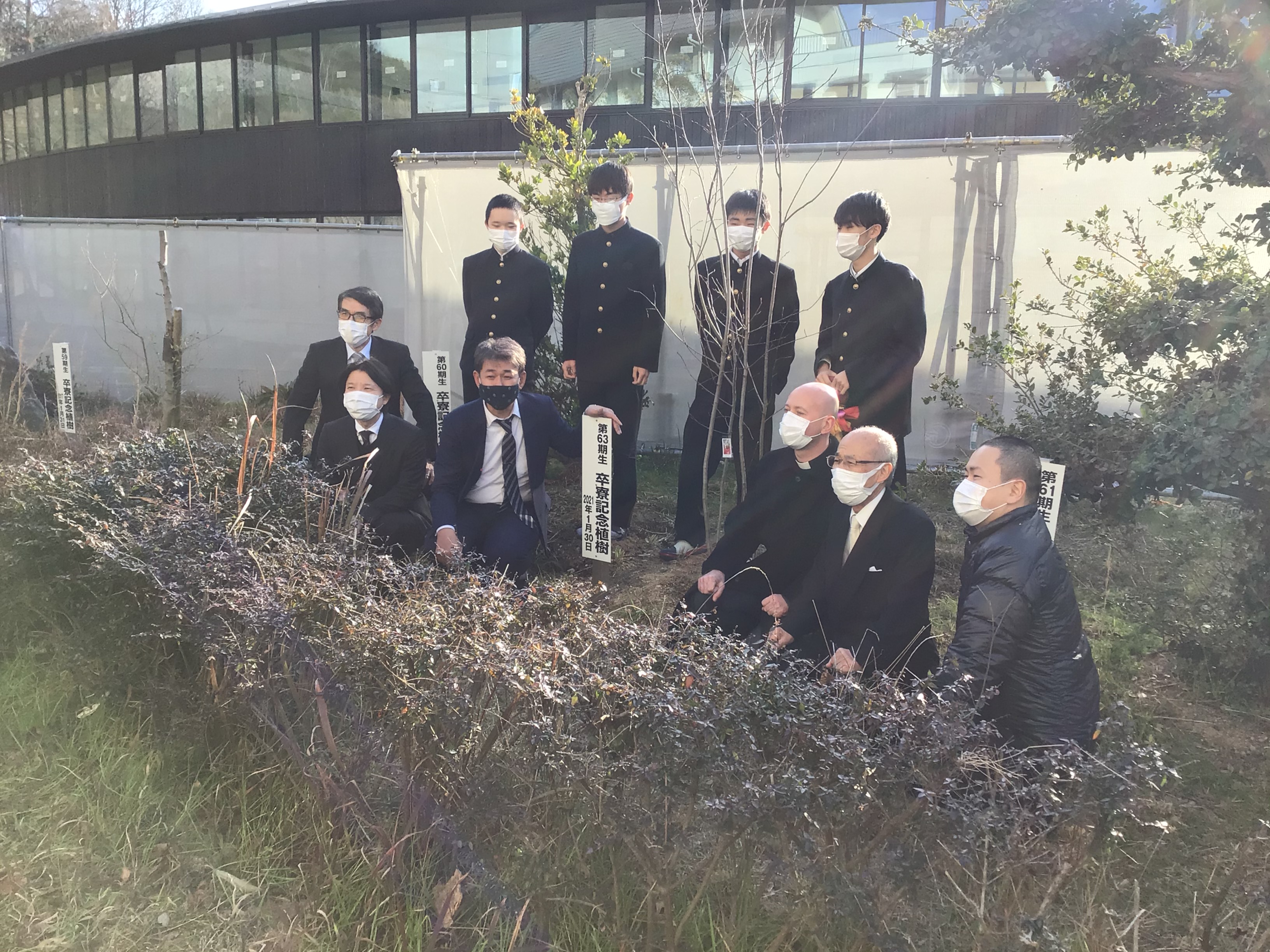 開式に先立ち、植樹したグリーンベリーの木との各班ごとの記念撮影です。