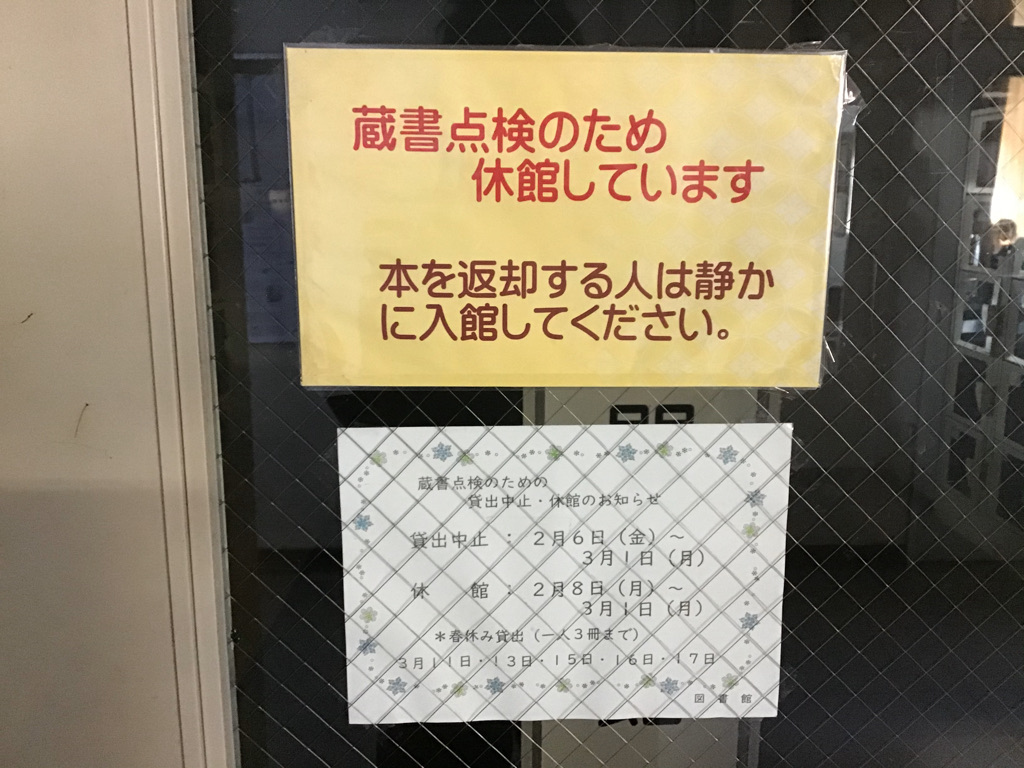 図書館にお邪魔しようと思ったのですが、蔵書点検で休館中です。