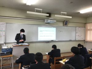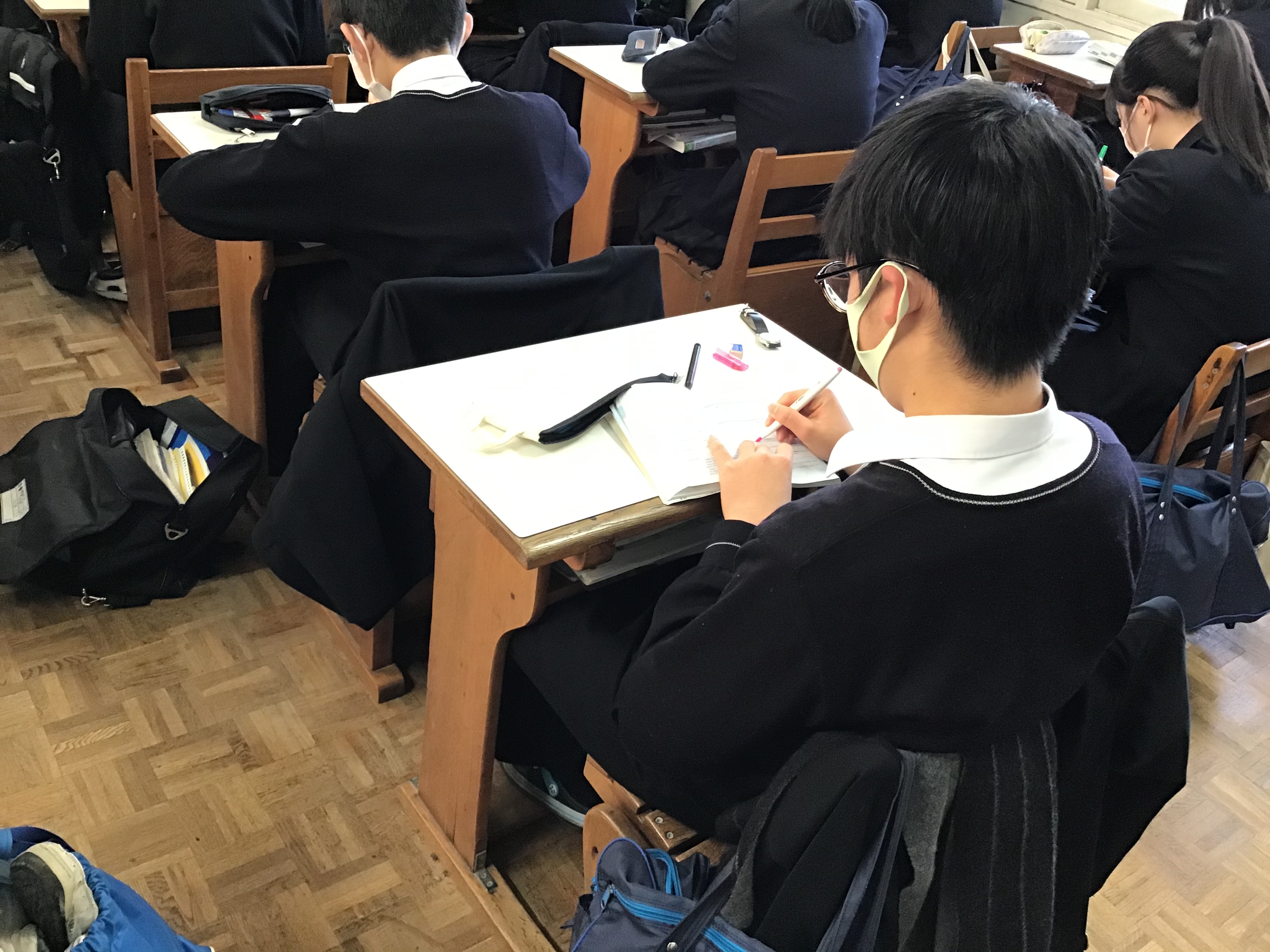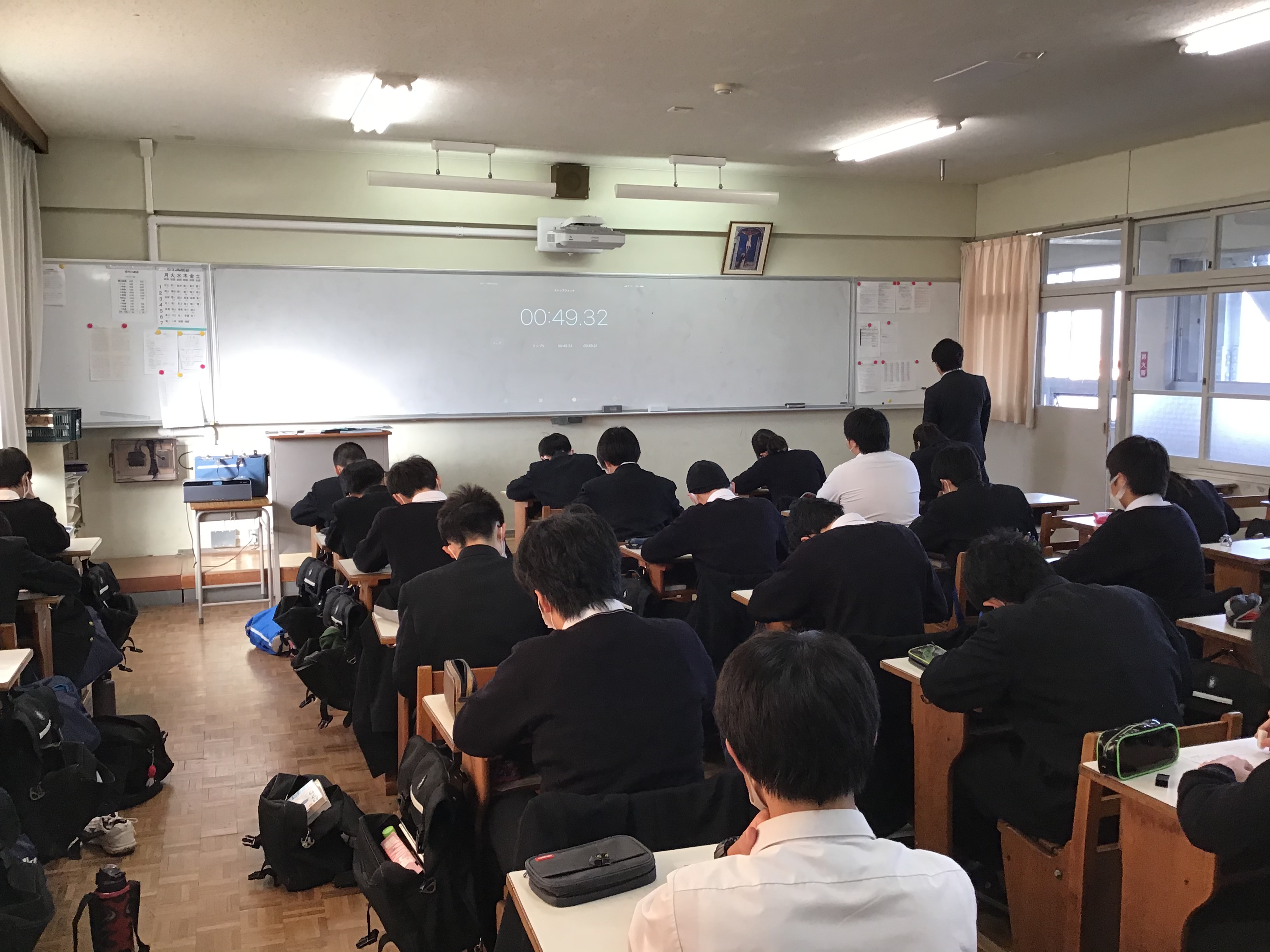 3学期の、中学3年生の英語の授業の様子です。まず、小テストから始まります。毎時間取り組んでおり、不合格者には、ペナルティが課せられます。