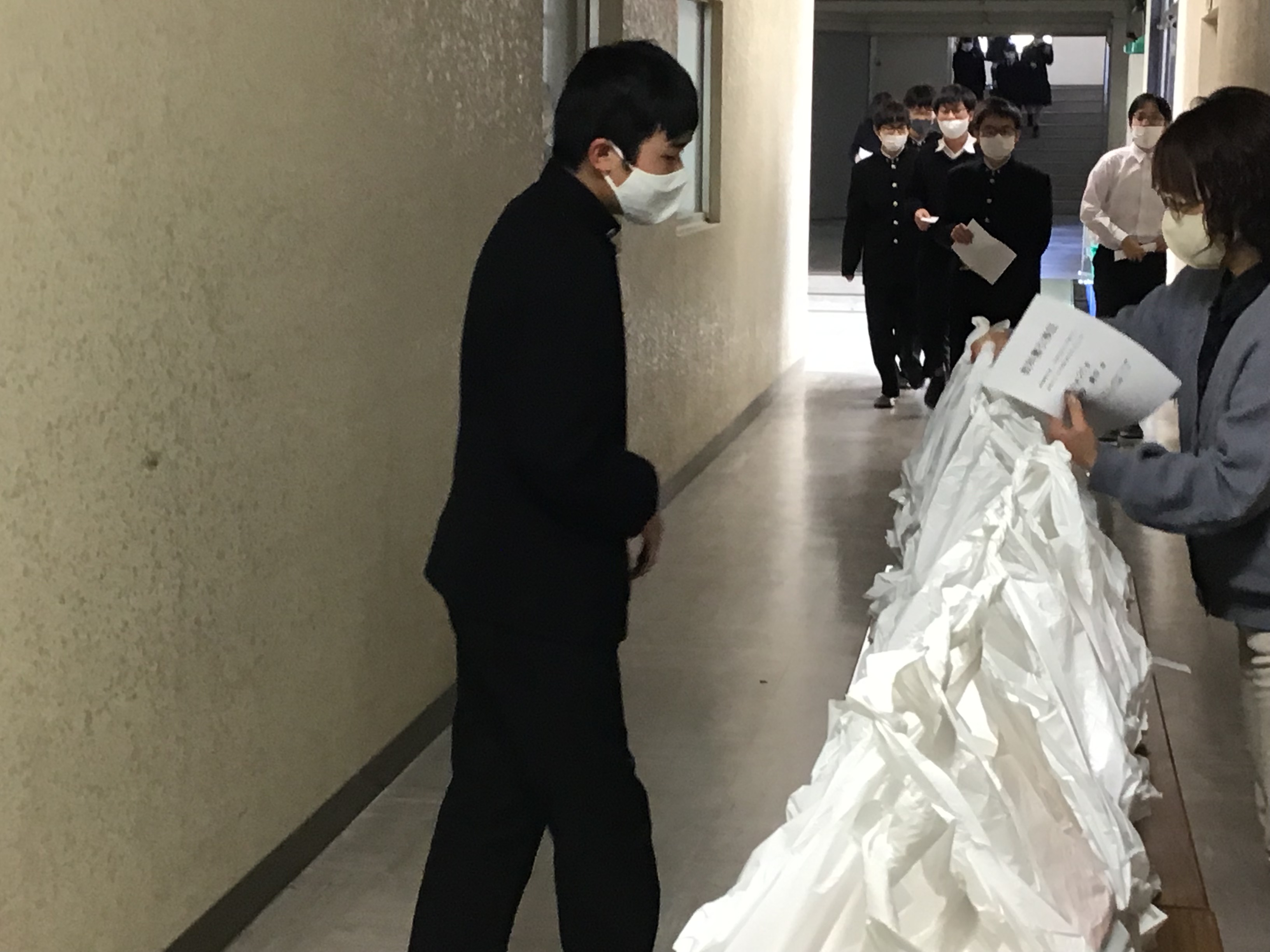 本日の試験終了後,配付場所に生徒たちが受け取りに来るのを書店の方が待っています。