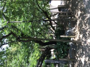 松山は今日も快晴で、少し暑さも感じました。学園のある衣山は、後ろに総合公園があり、緑に囲まれています。この辺りを散歩する生徒や教員もいるのですが、私の好きな場所は大宝寺です。大きなお寺ではないのですが、本尊の阿弥陀如来像は国の重要文化財で、小泉八雲の小説『怪談』にもおさめられている、うば桜伝説の桜の木があります。本堂に通じる階段をのぼると、涼しい風が吹いてきて、自然の恵みを実感できます。