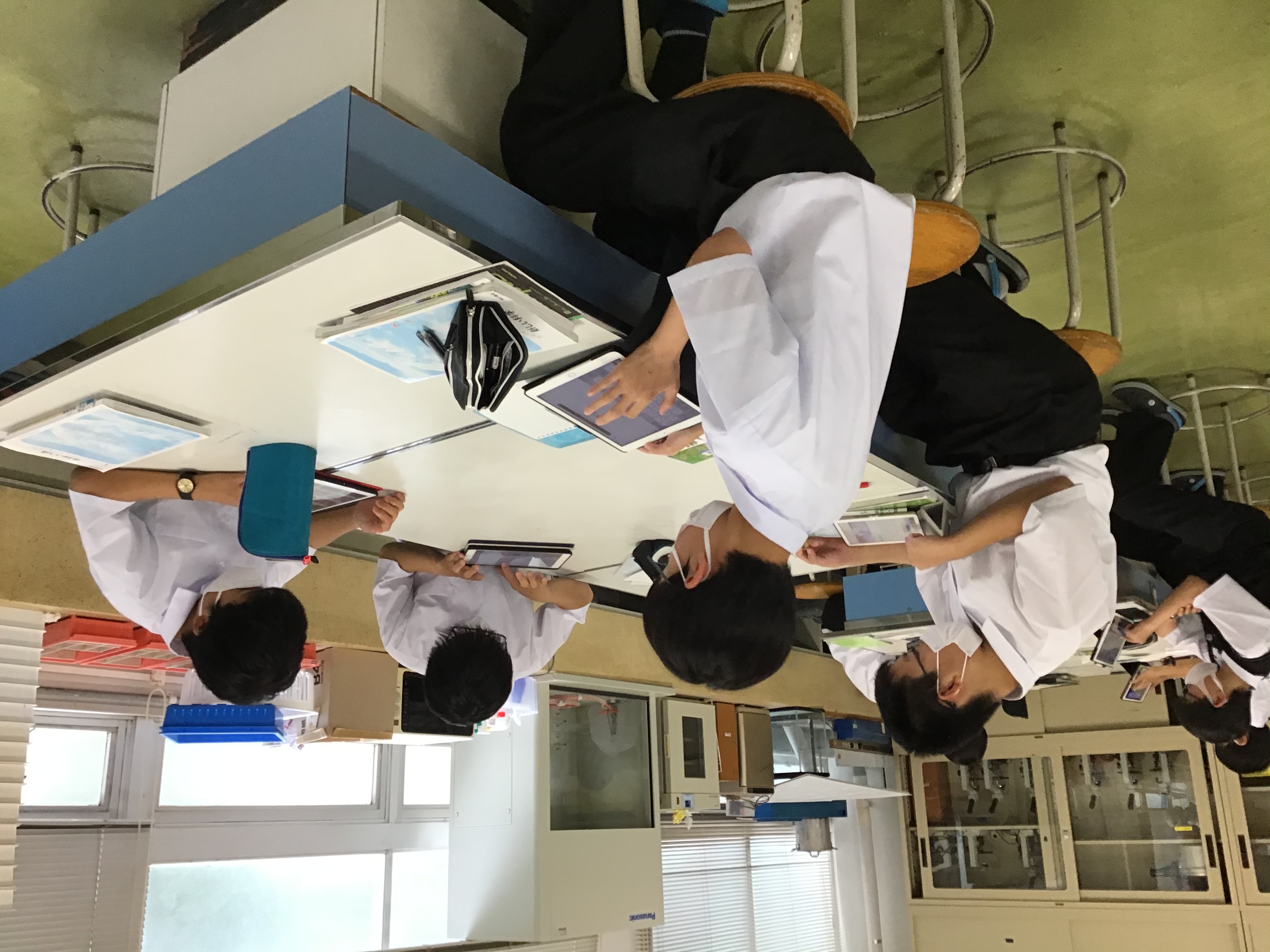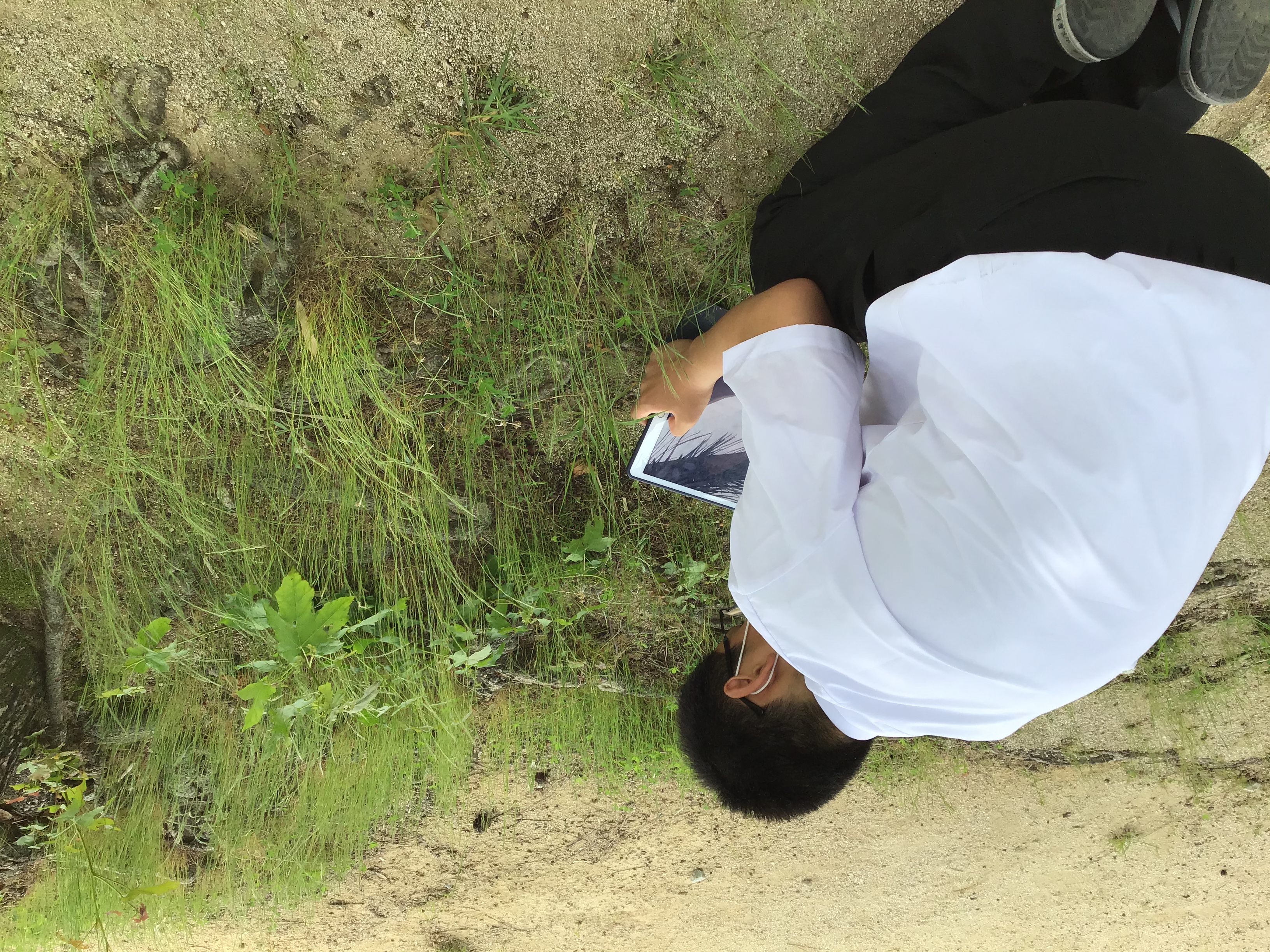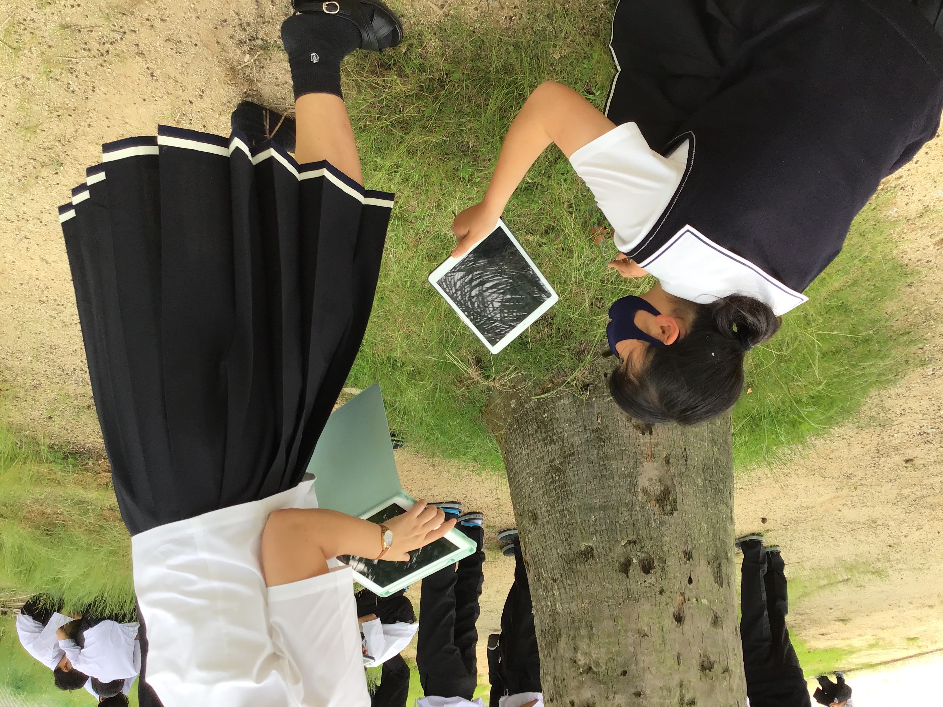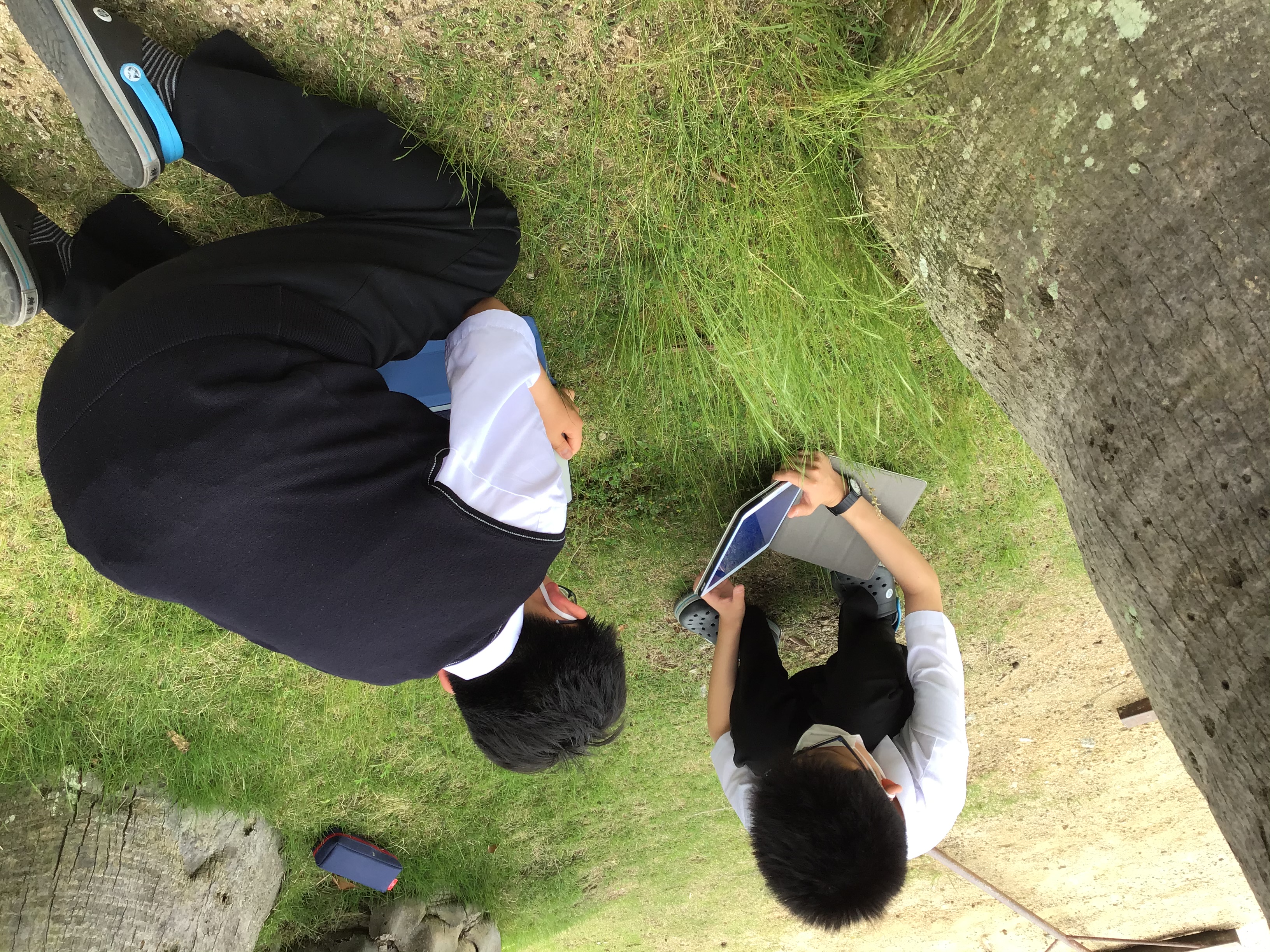 松山は午後から曇りです。中一生の理科3の授業で、教員の指導のもと、校内の雑草の調査が行われました。校内に生えている雑草を見つけ、タブレットを用いてその名称や校内での分布を調べていきます。