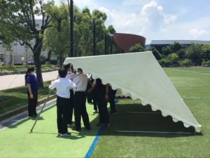 女子は体育館からパイプ椅子を運ぶ作業、男子はテント設営です。