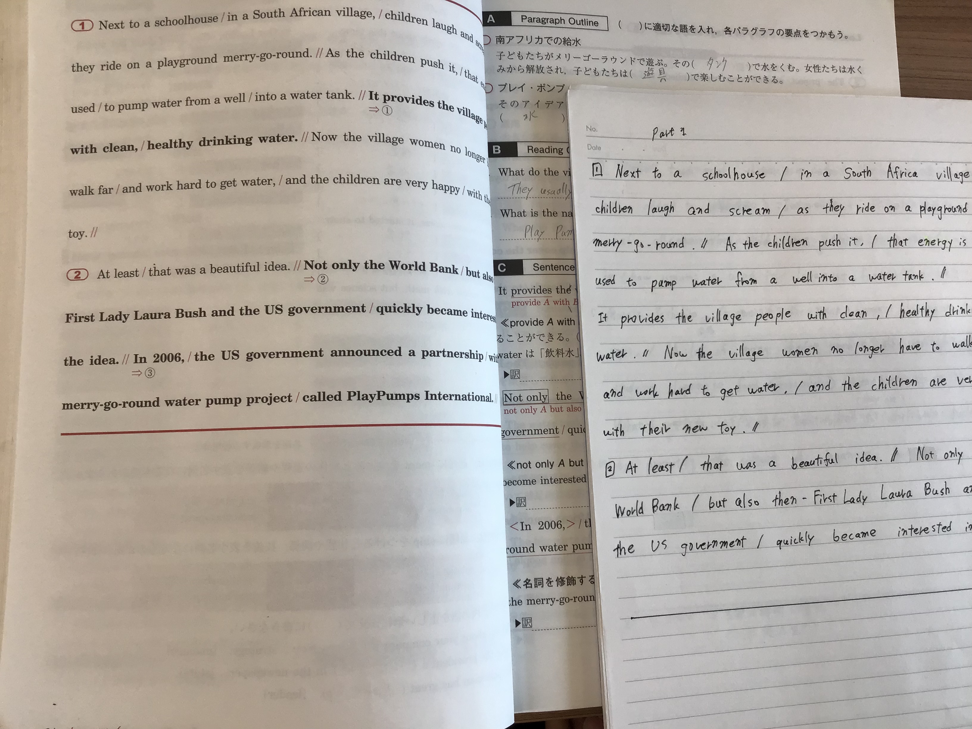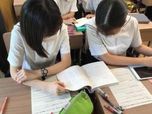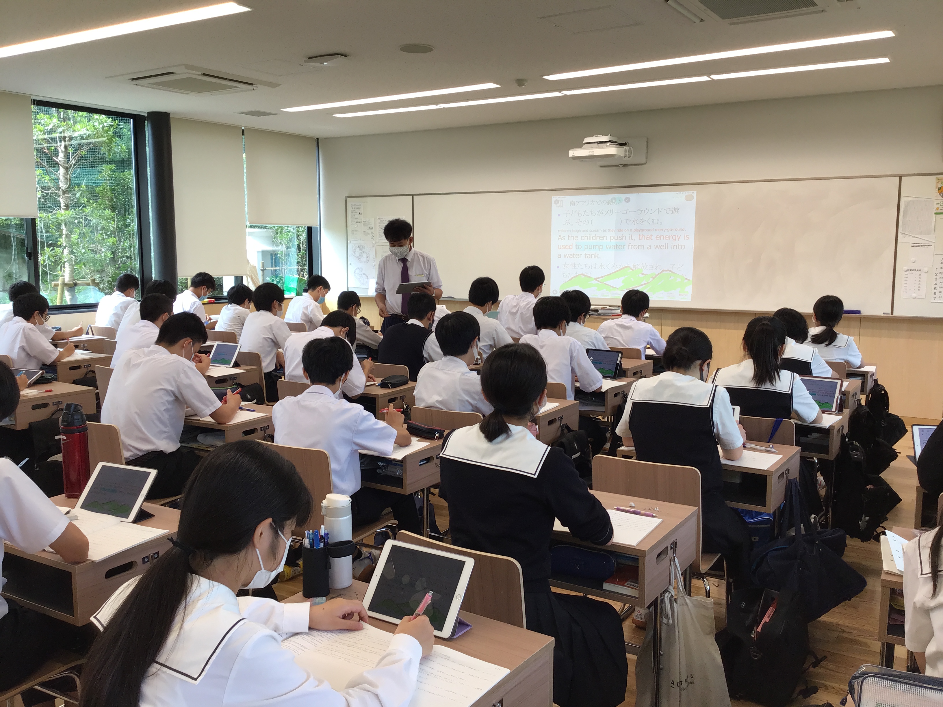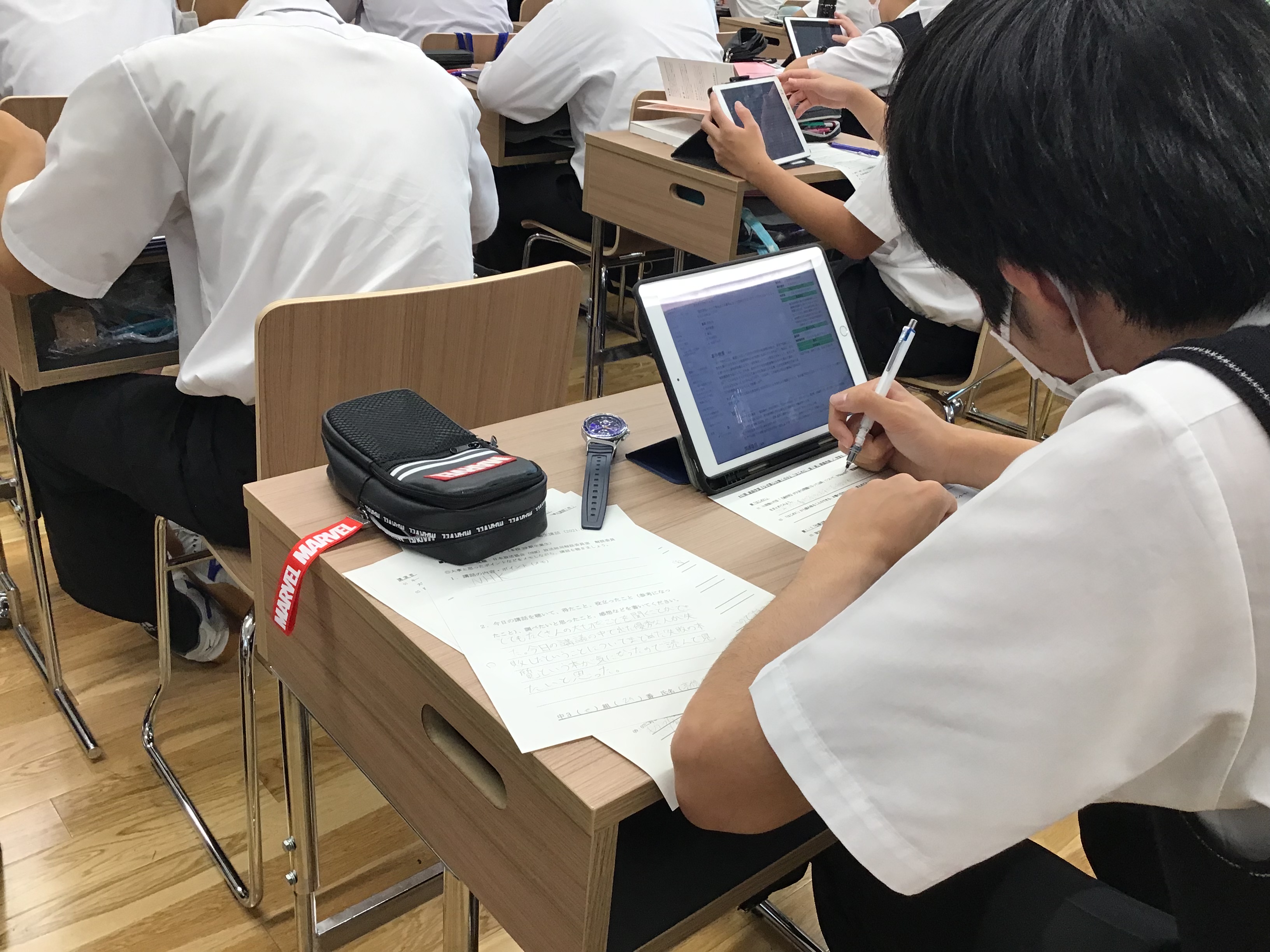 単語テストが終わり、授業の内容に入ります。授業の前に、教科書本文の英語をノートに書き、和訳をノートに書いてきています。タブレットでホワイトボードに投影されている映像を手元で見ることもでき、真剣に取り組んでいました。