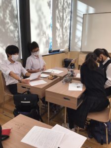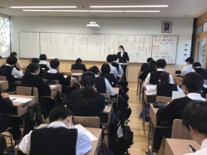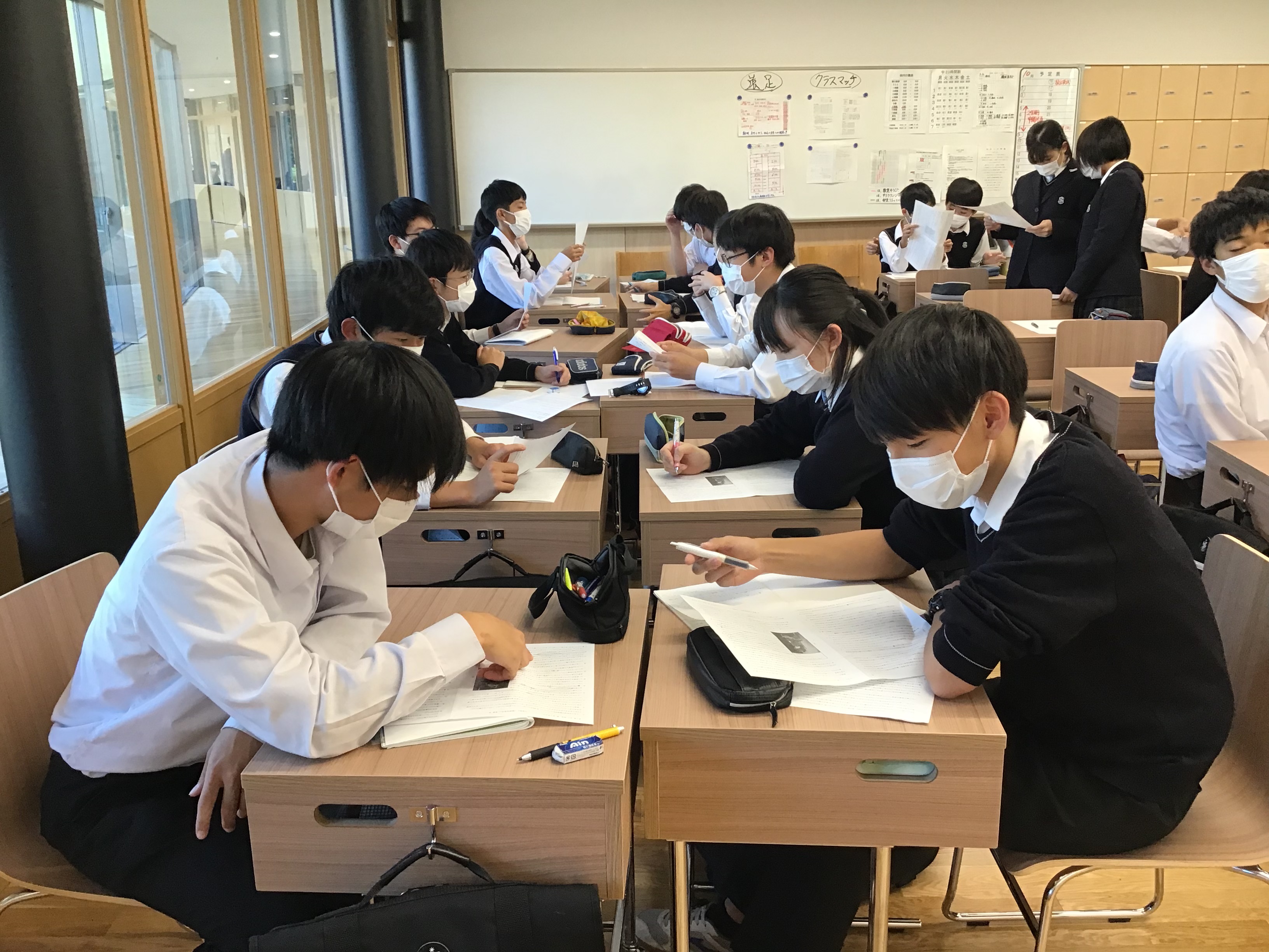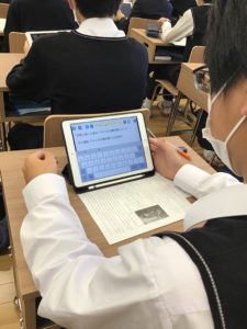 課題に対する考え方を確認し、ノートを取ります。ノート提出はタブレットを使い行っていました。皆、真剣に取り組み考えを深めていました。